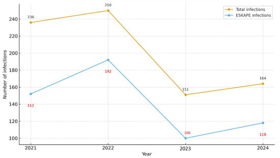 Between 2021 and 2024, a total of 801 infections were documented in the adult ICU. Of these, 562 cases (70.2%) were attributed to pathogens from the ESKAPE group. The annual distribution of these infections is summarized in Table 1 and illustrated in Figure 1. In 2021, a total of 236 infections were documented, of which 152 (64.4%) were attributable to ESKAPE pathogens. In 2022, both the overall infection count and the absolute number of ESKAPE-related cases increased, reaching 250 and 192, respectively, with ESKAPE organisms accounting for the highest annual proportion (76.8%). In 2023, the total number of infections declined to 151, including 100 ESKAPE cases (66.2%). In 2024, 164 infections were recorded, of which 118 (72.0%) were caused by ESKAPE pathogens.