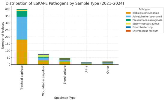 Distribution of ESKAPE pathogens by specimen type (2021–2024).