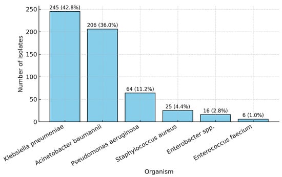 The ESKAPE group accounted for the vast majority of ICU isolates throughout the study period. Within this group, Klebsiella pneumoniae was the most frequently identified species (245 isolates, 42.8%), followed by Acinetobacter baumannii (206 isolates, 36.0%) and Pseudomonas aeruginosa (64 isolates, 11.2%). Gram-positive members were less common, with Staphylococcus aureus accounting for 4.4% (25 isolates) and Enterococcus faecium accounting for 1.0% (6 isolates). Enterobacter spp. were detected in 16 cases (2.8%) (Table 4, Figure 3).