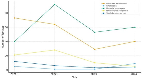 The temporal variability observed in isolate distribution, particularly the pronounced peak in Klebsiella pneumoniae isolates during 2022, may be attributable to several interrelated factors. Fluctuations in patient case-mix—such as changes in the proportion of severely ill, mechanically ventilated, or immunocompromised individuals—can significantly influence the prevalence of specific pathogens in intensive care settings. In addition, variations in antimicrobial use patterns, including the increased reliance on broad-spectrum or empiric antibiotic therapy during periods of clinical uncertainty, may have exerted selective pressure favoring the proliferation of resistant K. pneumoniae strains. The ongoing impact of the COVID-19 pandemic may also have contributed, as resource constraints, staff shortages, and disruptions in infection prevention practices have been linked to temporary surges in healthcare-associated infections globally [,,,].