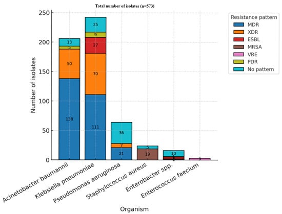 Resistance classifications follow the international definitions proposed by Magiorakos et al.: MDR—multidrug-resistant, XDR—extensively drug-resistant, and PDR—pan-drug-resistant []. Among ESKAPE organisms, nearly half of isolates (271, 47.3%) were classified as multidrug-resistant, while 128 isolates (22.3%) were extensively drug-resistant. A smaller proportion exhibited no specific resistance pattern (89 isolates, 15.5%) (Table 5 and Figure 5).