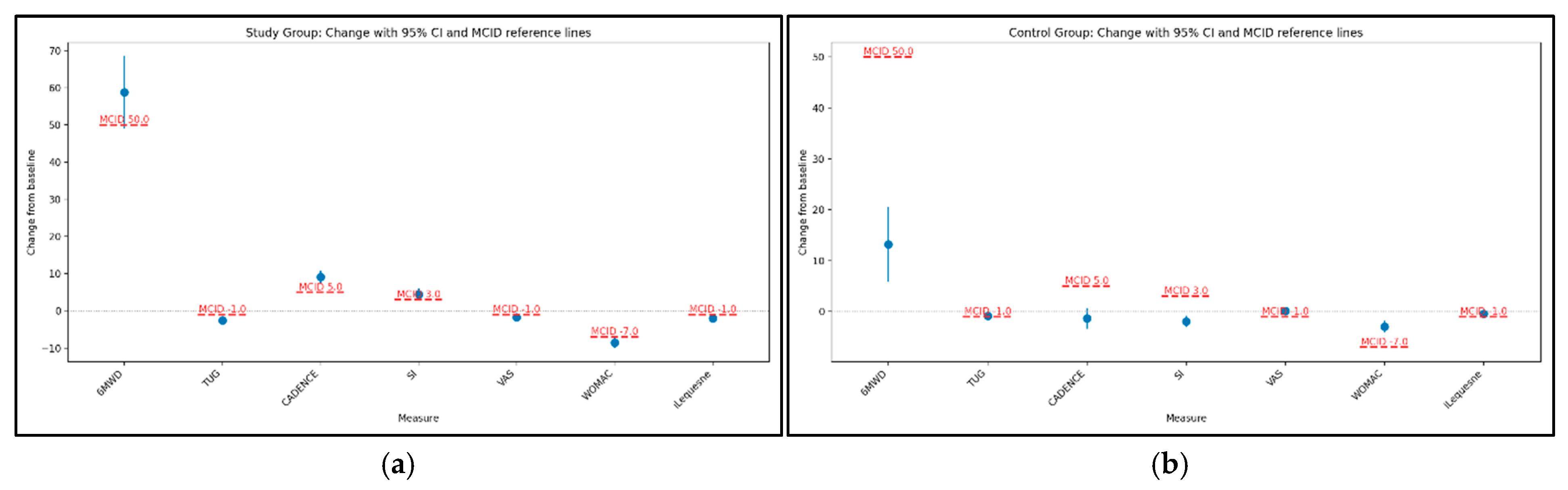 | Group | Measure | n | Baseline (Mean ± SD) | Post (Mean ± SD) | Delta (95% CI) | p-Value | Effect Type | Effect Size |