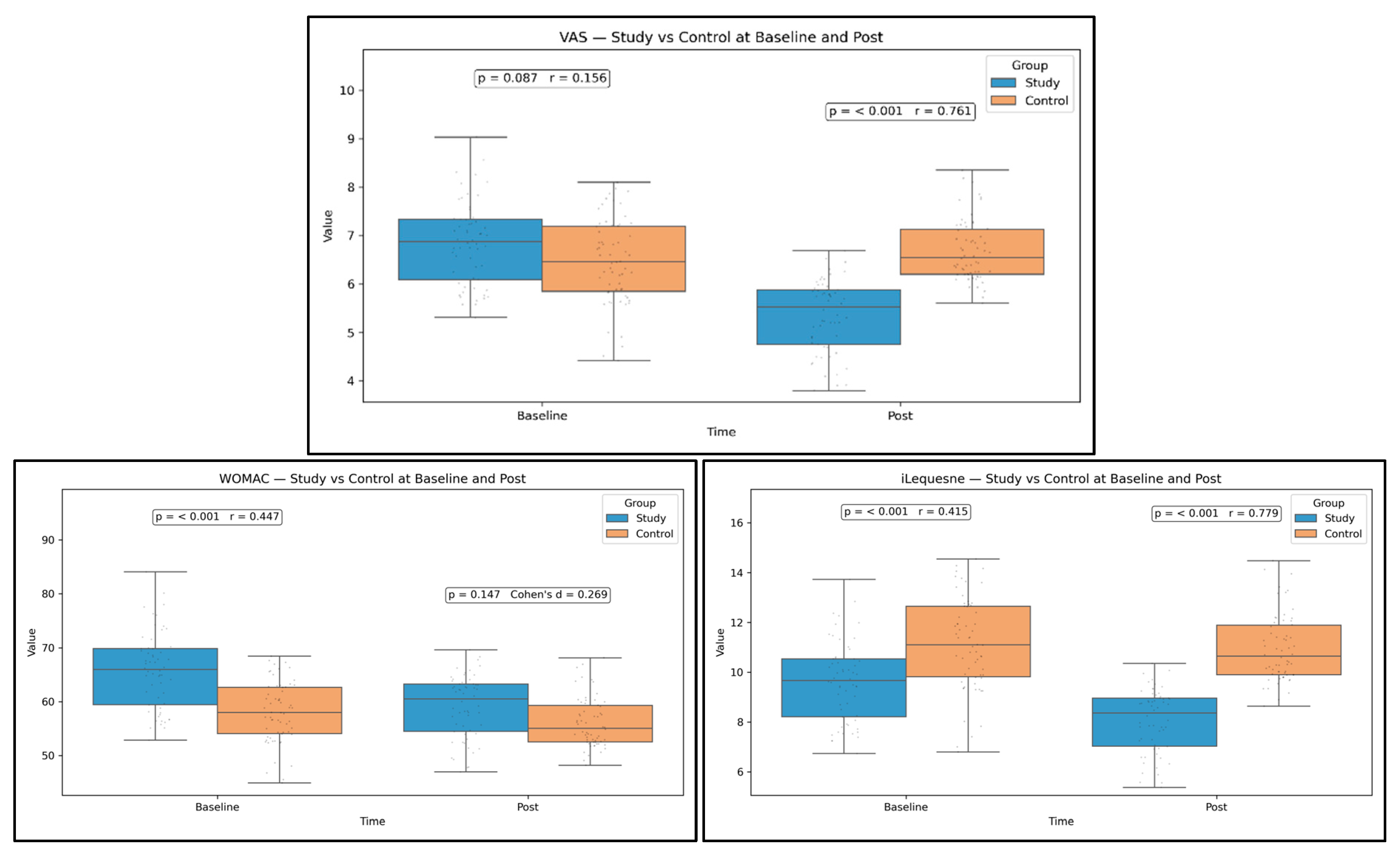 | Study | Lequesne Index | 58 | 9.59 ± 1.8 | 7.6 ± 1.31 | −1.98 (−2.237 to −1.728) | <0.0001 (3.88 × 10−11) | r | 0.868 |