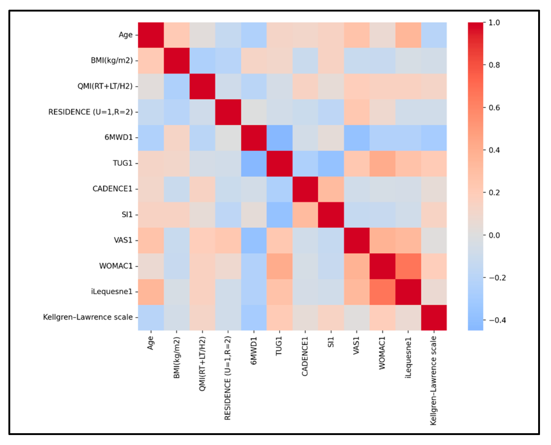- 6MWD shows negative moderate associations with TUG VAS, and small with the Lequesne index, indicating that a greater walking capacity aligns with faster TUG, less pain, and slightly lower Lequesne disability.