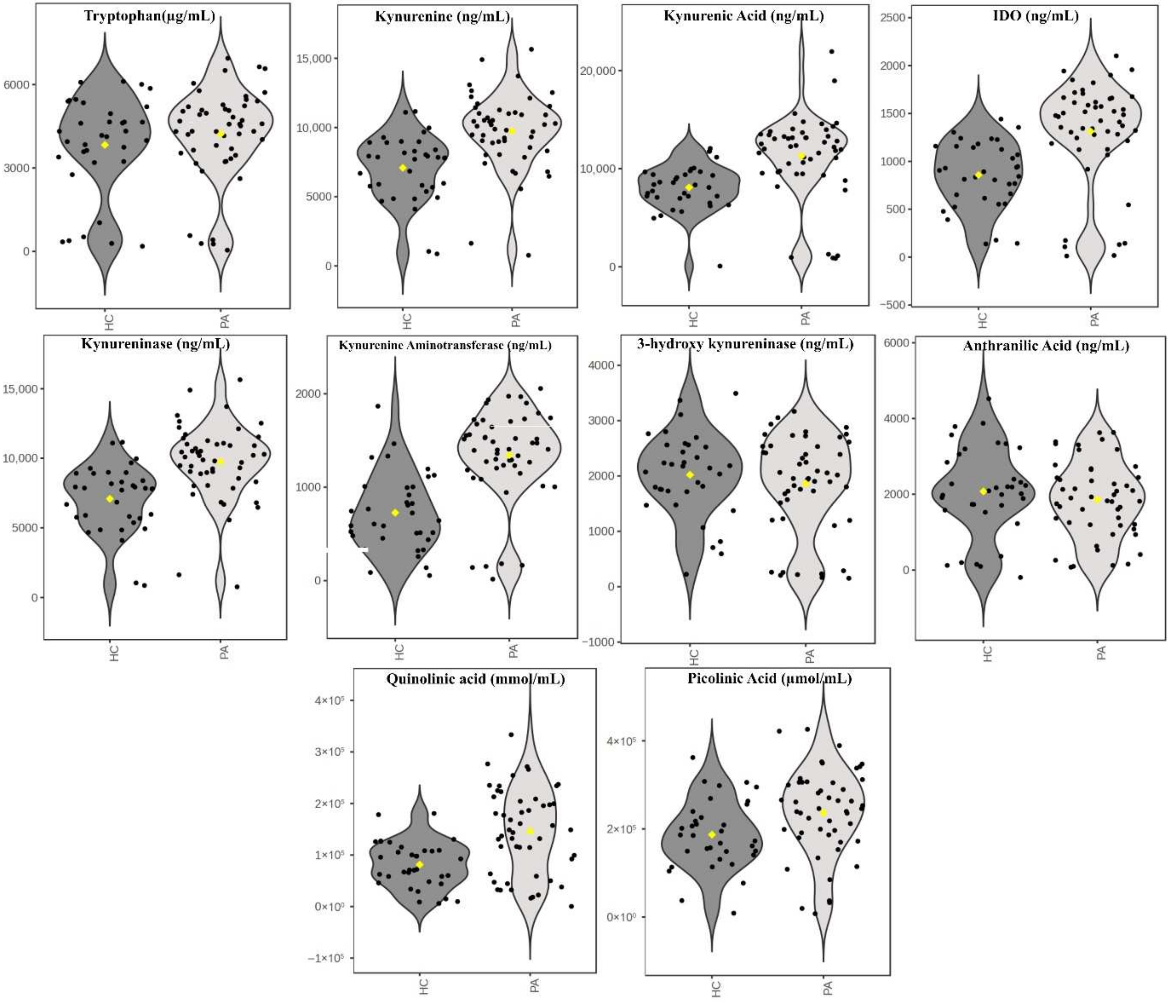 Figure 3B). These variables were followed by kynurenine, kynurenine aminotransferase, and IDO, respectively. The color scale indicates that quinolinic acid and picolinic acid levels were higher in the PA group compared to the HC group (red), while other significant metabolites were relatively higher in the HC group (blue).