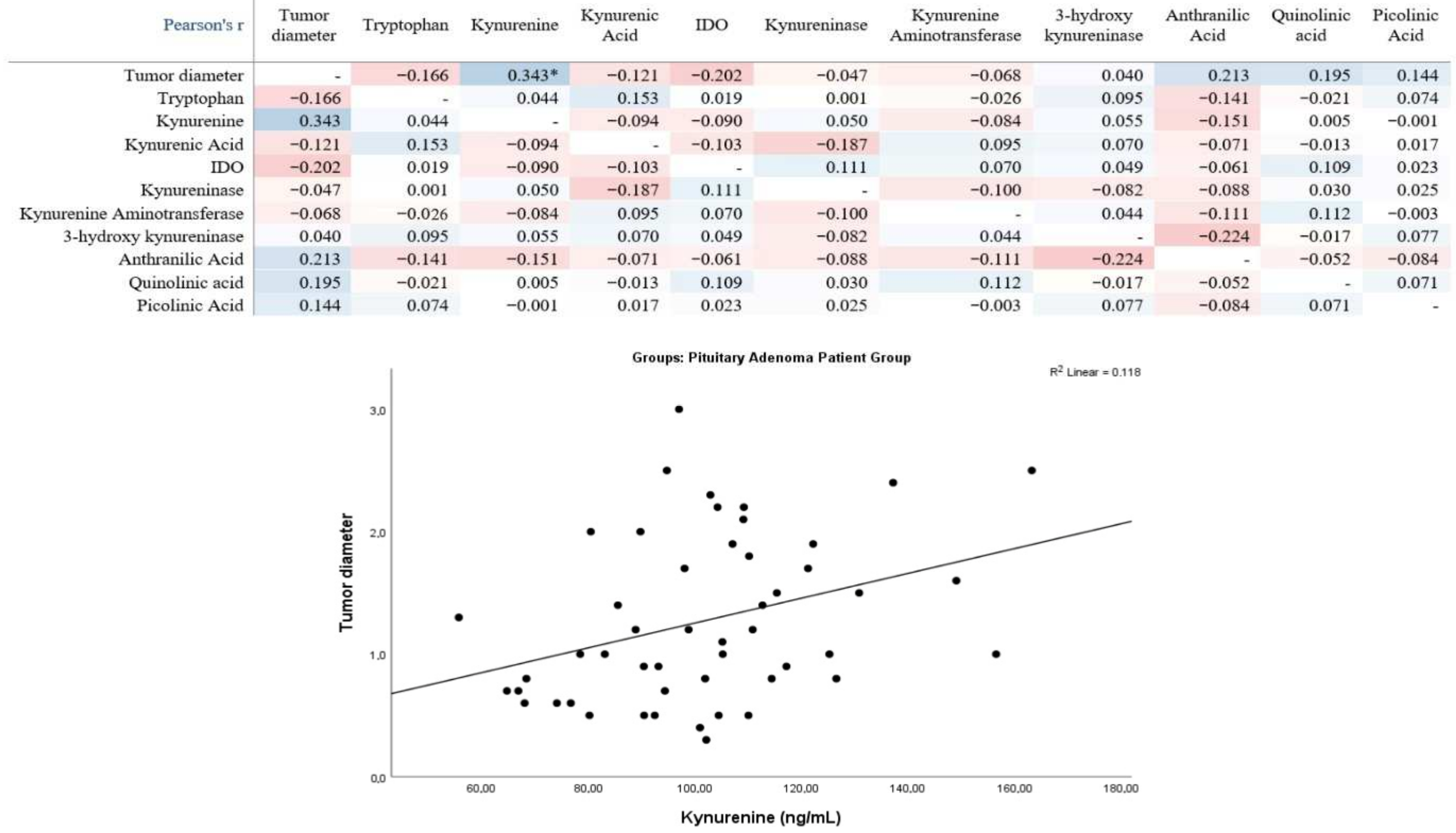 Pearson correlation analysis in the pituitary adenoma patient group revealed a statistically significant positive correlation between tumor diameter and kynurenine levels. No statistically significant correlations were observed between tumor diameter and tryptophan, kynurenic acid, indoleamine-2,3-dioxygenase (IDO), kynureninase, kynurenine aminotransferase, 3-hydroxykynureninase, anthranilic acid, quinolinic acid, or picolinic acid. Other pairwise correlations between metabolites and enzymes were mostly weak and not statistically significant. The linear trend in the scatterplot was consistent with the direction of the positive correlation between tumor diameter and kynurenine (