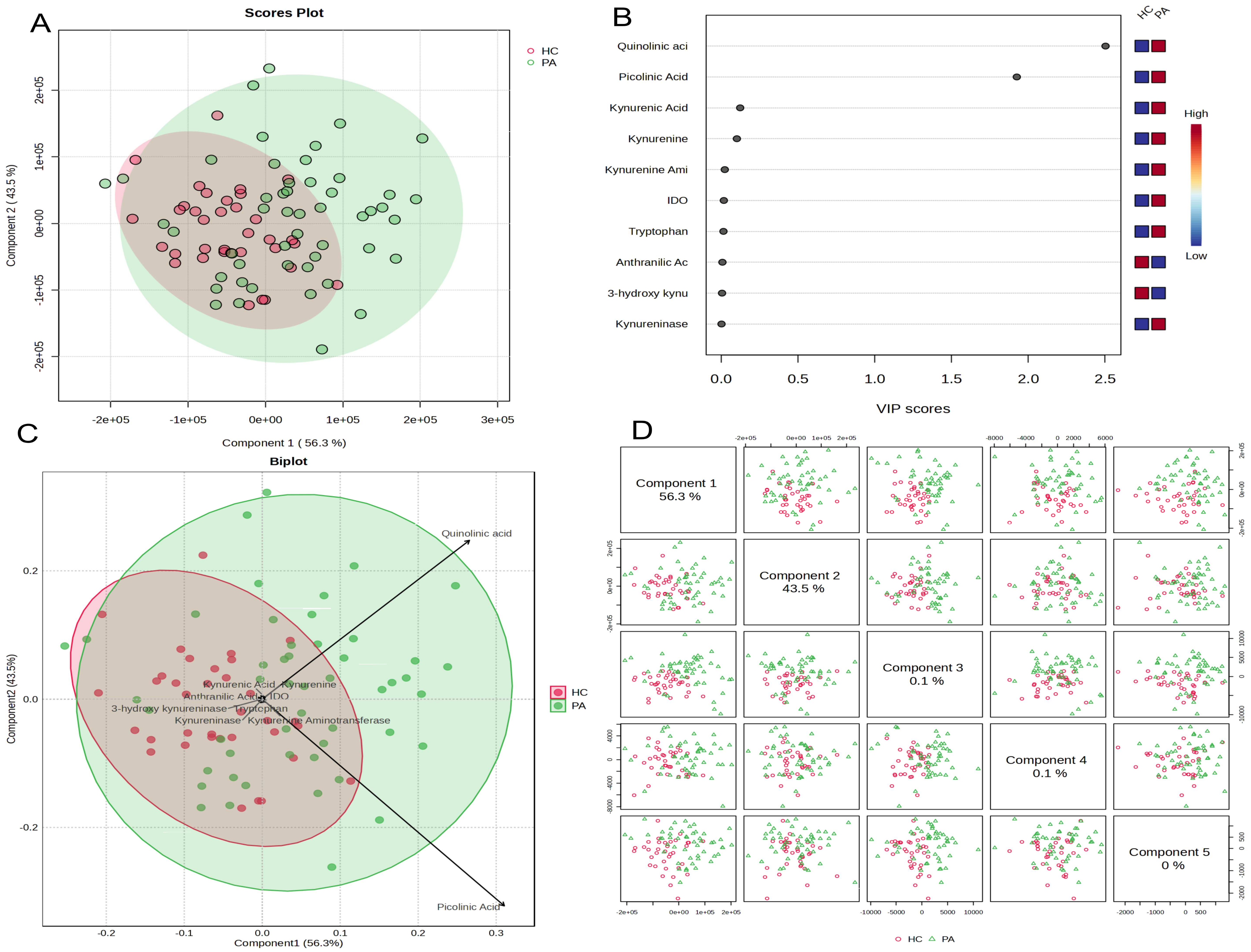Figure 3C). The extension of the quinolinic acid and picolinic acid vectors toward the region where the PA patient group clusters confirms that these two metabolites are positively correlated with the PA group and that their increases in this group play a key role in discrimination. On the other hand, metabolites such as 3-hydroxykynurenine, kynurenine, and kynurenine aminotransferase are located closer to the region where the HC group clusters.