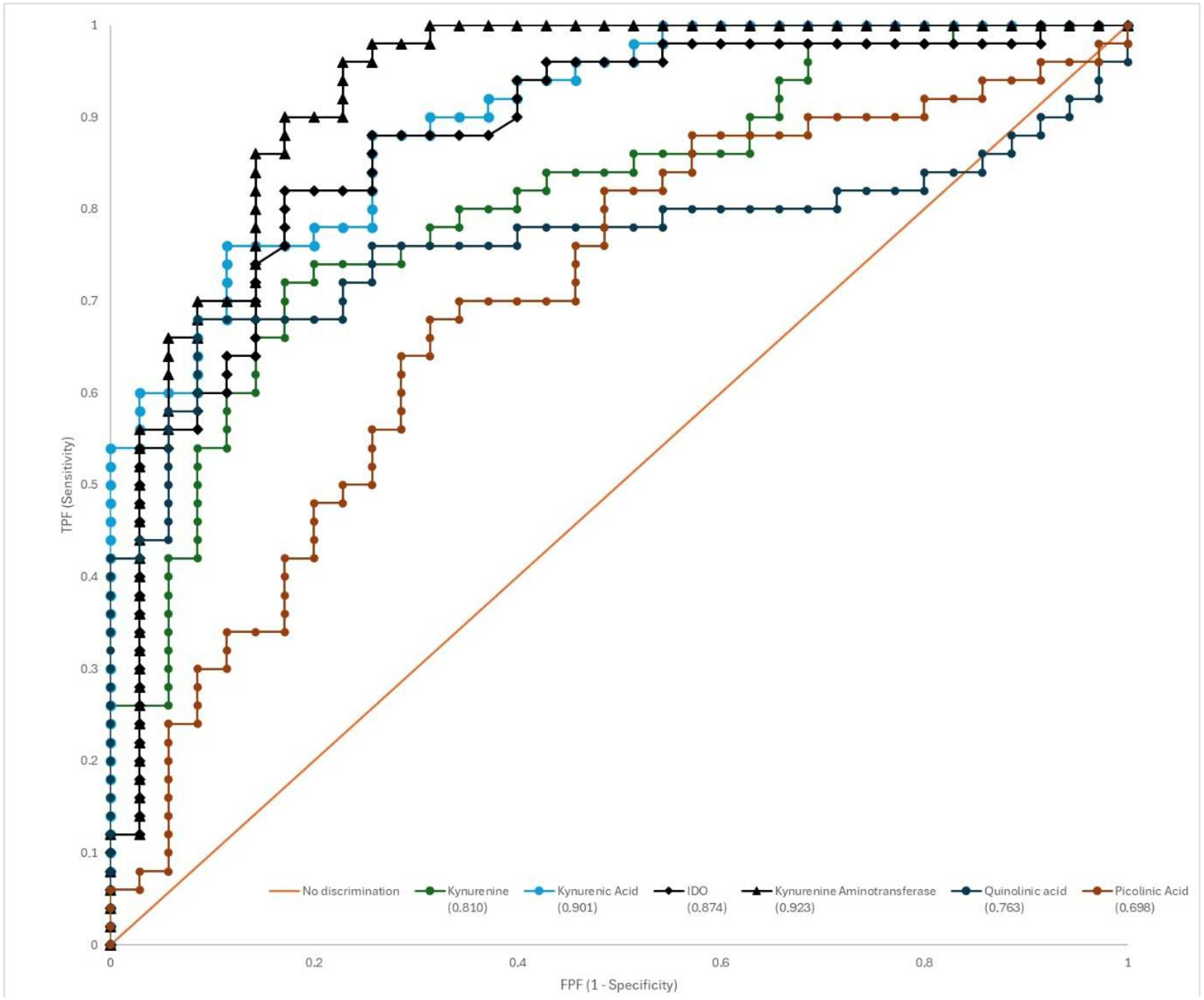 We first conducted ROC analysis for tryptophan, kynurenine pathway metabolites, and related enzymes. ROC curves and diagnostic properties of variables with AUC values above 0.7 are presented in