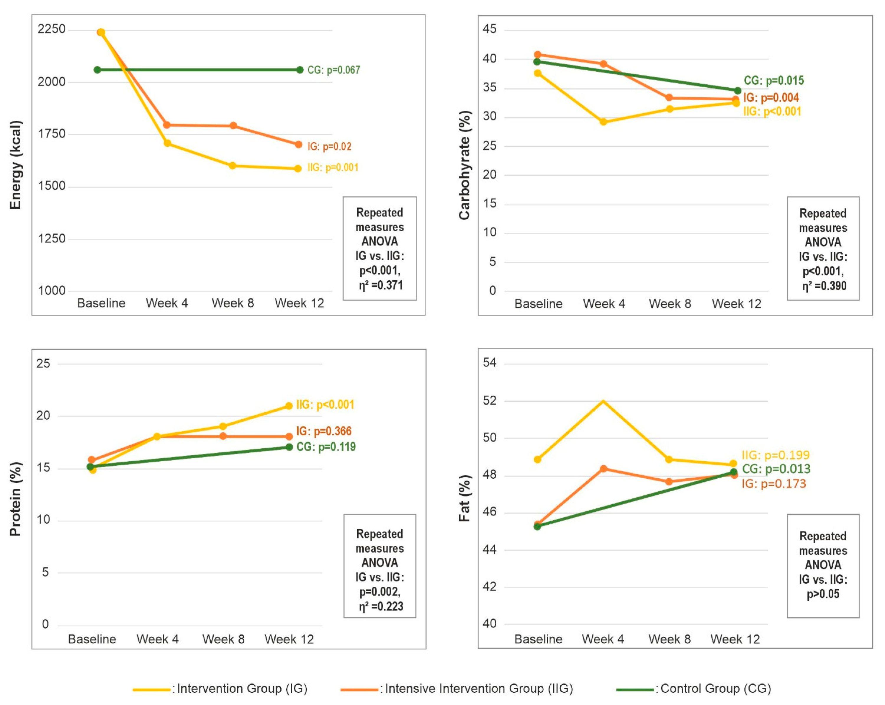 | Energy (kcal) | Baseline | 2242.4 ± 774.4 | 2144.2 (1093.9–3723.9) | 2250.4 ± 574.3 | 2140.85 (1389–3583) | 2066.3 ± 648.5 | 2082.5 (1041–3608.9) | IG: 0.02 a w0 > w4, w8, w12 IIG: 0.001 a w0 > w4, w8, w12 CG: 0.06 c | 0.47 e | F (2.4, 140.8) p < 0.001 a η2 = 0.371 |