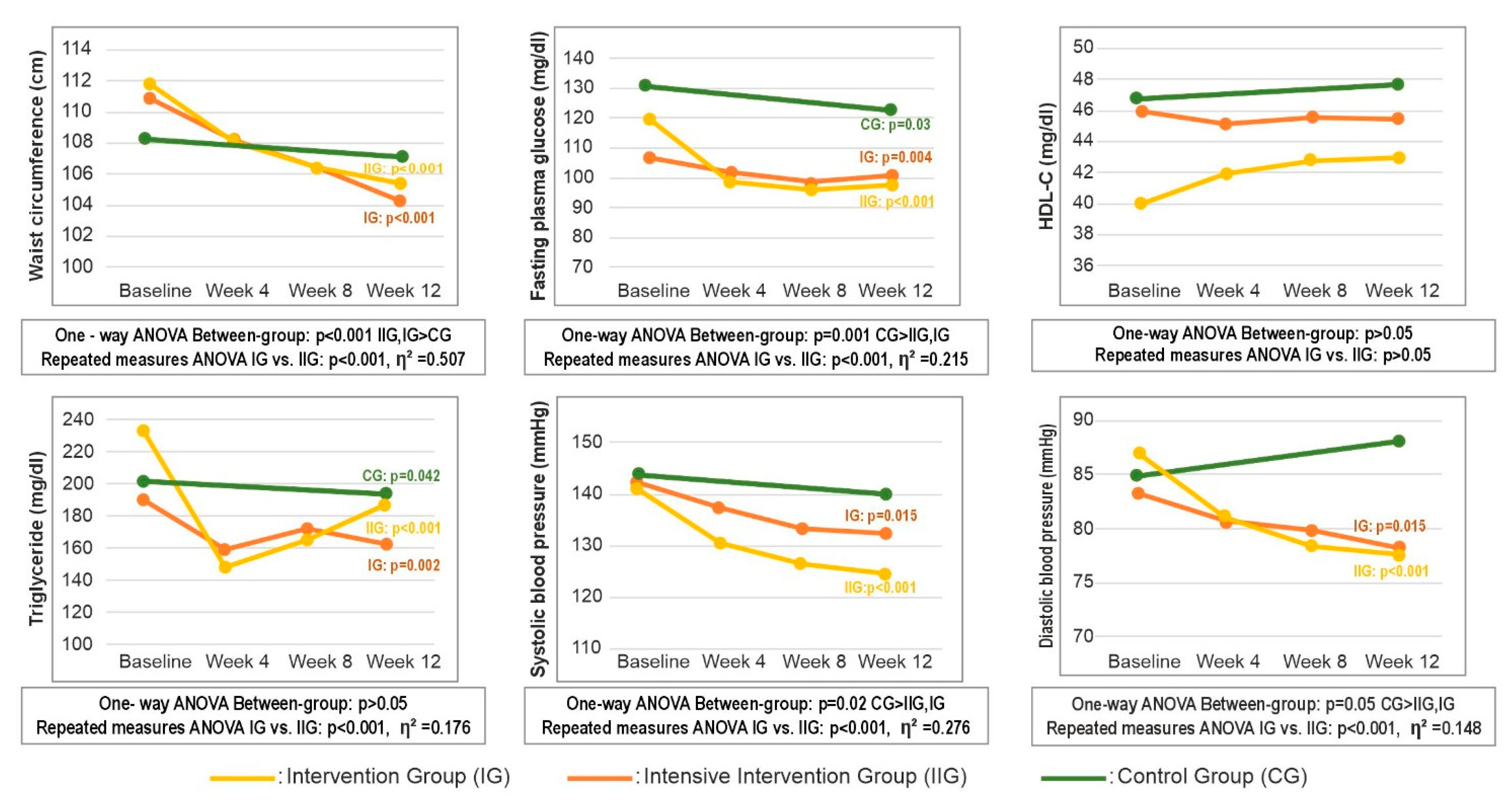 | Week 12 | 78.23 ± 10.4 | 77 (60–103) | 77.6 ± 8.2 | 78 (60–96) | 88.3 ± 86 | 86 (61–129) | 0.005e CG > IG, IIG | |||
