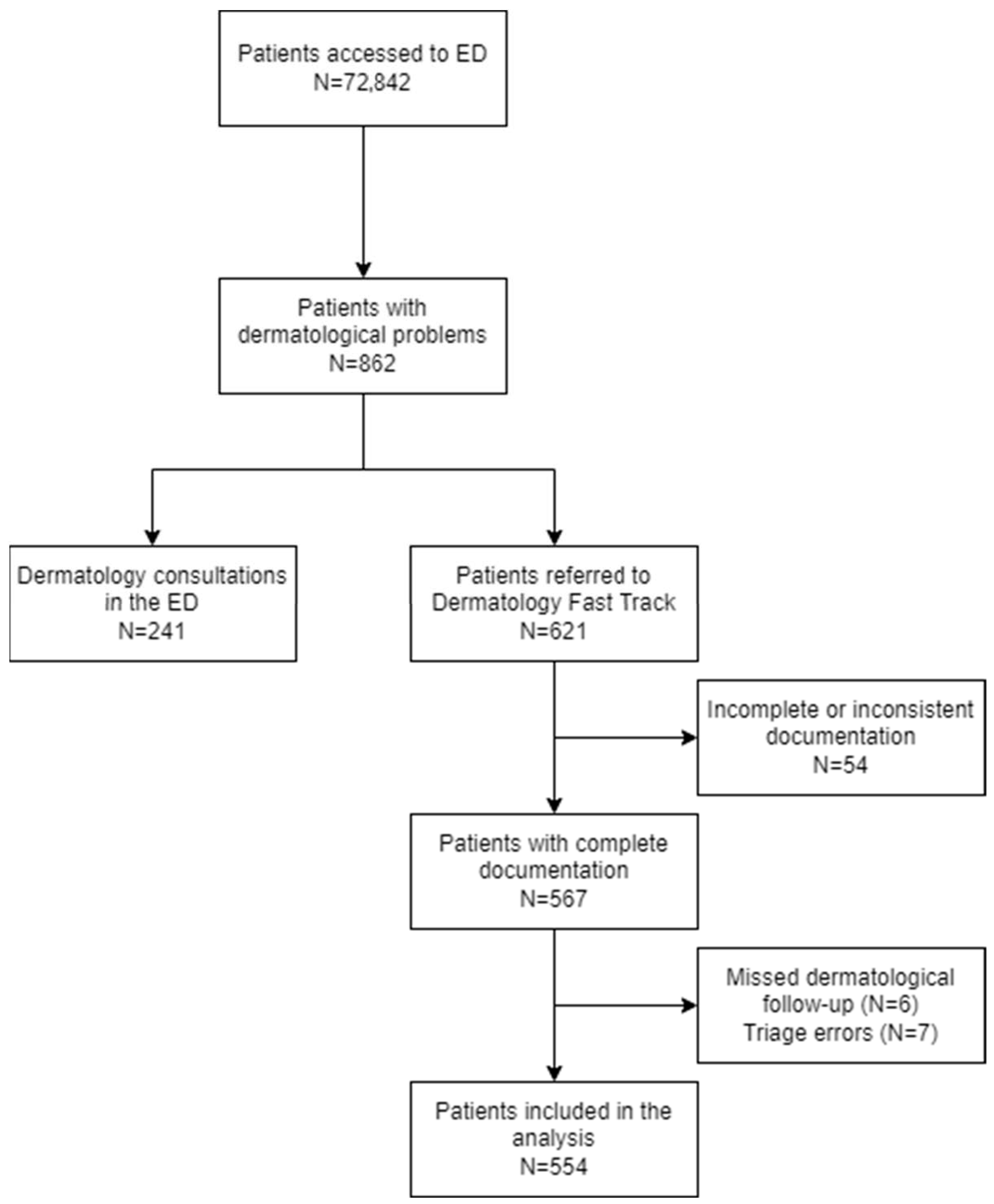 Of these 621 patients, 54 were excluded due to incomplete demographic or clinical data. Among the remaining 567 patients, an additional 13 were excluded: 7 patients (1.23%) due to triage errors, as they did not present with dermatological complaints (2 white codes and 5 green codes), and 6 patients (1.06%) who left the ED before undergoing the dermatological consultation (3 white codes and 3 green codes).