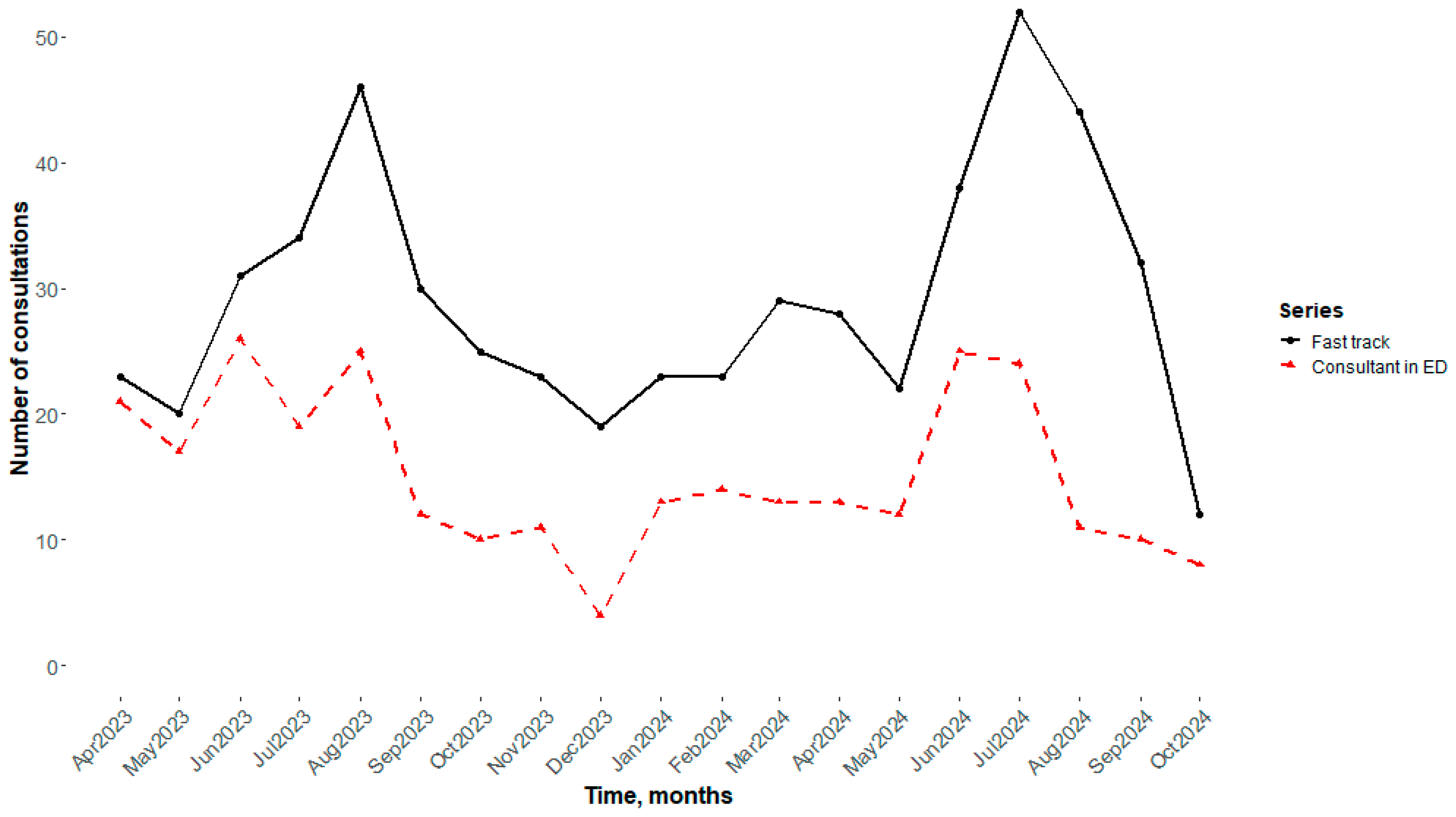 Analysis of the monthly distribution of visits to the dermatology fast-track service (black line) and consultant in ED (red line) over the study period suggests a clear seasonal pattern (Figure 2). The number of consultations tended to increase during the summer months, with peaks observed in August 2023 and July 2024. Lower numbers of visits were recorded during the winter months, particularly in December 2023 and October 2024. This pattern indicates a higher demand for dermatological consultations in the warmer months.