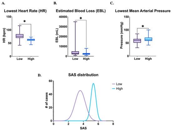 From January 2005 to December 2021, 156 cases of PAS were managed by the multidisciplinary team at our institution. Of these, 127 met inclusion and exclusion criteria as described previously. Intraoperative records for all patients were available and reviewed. 84 patients (66.1%) had a “low” SAS score of 0–4 and 43 (33.9%) had a “high” SAS score of 5–8. SAS component confirmation showed statistically significant differences in heart rate, estimated blood loss, and mean arterial pressure (Figure 1A–C). SAS distribution among our patient population demonstrated that the majority of patients had a raw score of 4 or 5 (Figure 1D).