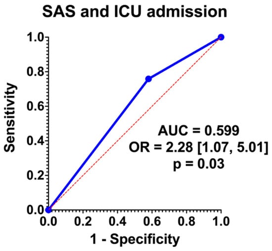 Logistic regression analysis showed that SAS 0–4 had an OR = 2.28 [95% CI 1.07, 5.01]. Graphical representation is noted in Figure 2. The area under the curve (AUC) was 0.599.