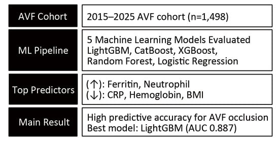 14. Shu, P.; Huang, L.; Wang, X.; Wen, Z.; Luo, Y.; Xu, F. Machine learning-based prediction model for arteriovenous fistula thrombosis risk: A retrospective cohort study from 2017 to 2024. BMC Nephrol. 2025, 26, 304. [Google Scholar] [CrossRef] [PubMed]