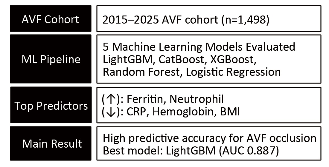In summary, this study demonstrates that machine learning, particularly gradient boosting algorithms such as LightGBM and CatBoost, can effectively predict AVF occlusion using routinely collected clinical and laboratory data. The incorporation of interpretable AI methods enhances transparency and clinical trust, providing a foundation for precision vascular access management and improved hemodialysis outcomes.