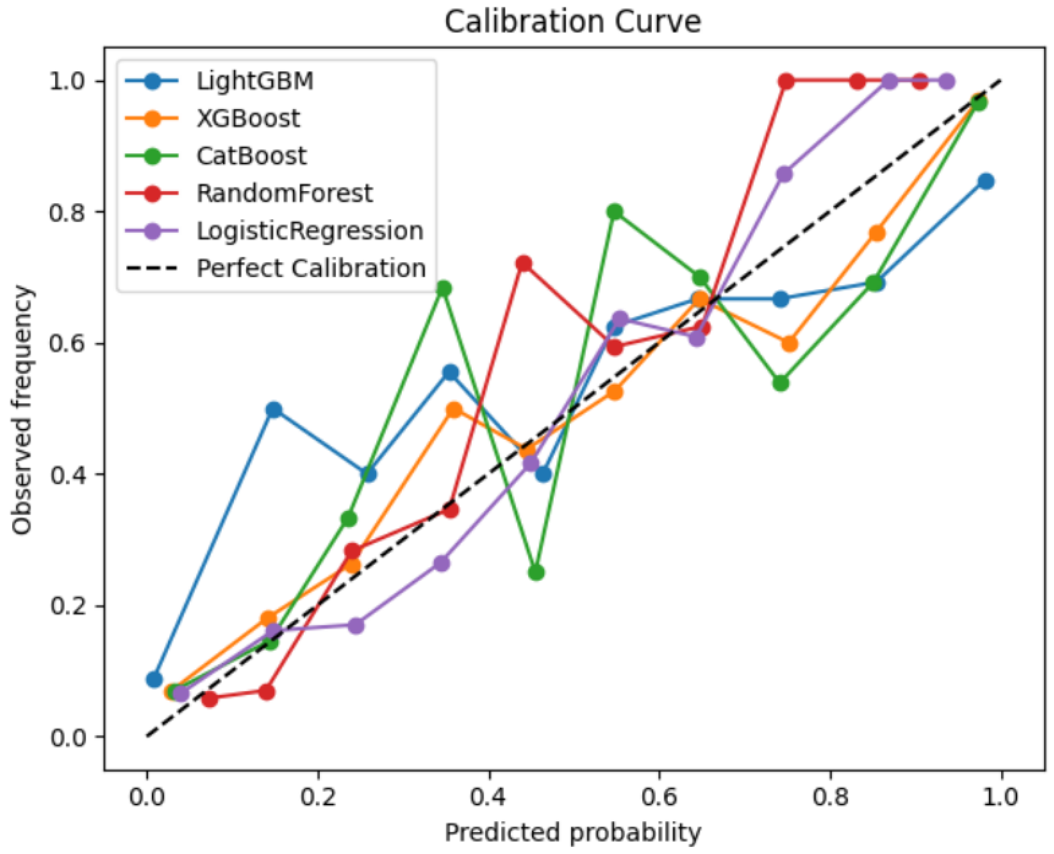 Together with calibration curve results (Figure 1), these findings indicate that LightGBM and CatBoost not only provided accurate probability estimation but also offered the best balance between sensitivity and specificity for clinical risk prediction.