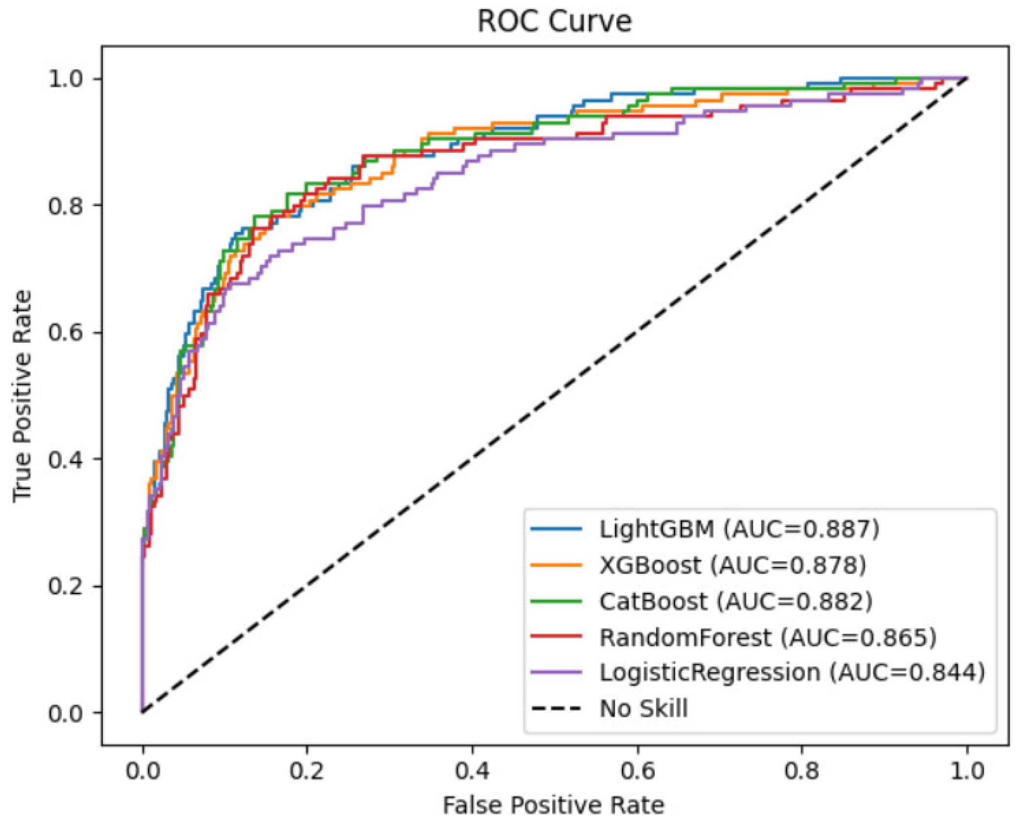 Five machine learning models—LightGBM, CatBoost, XGBoost, Random Forest, and Logistic Regression—were developed to predict AVF occlusion. Table 2 presents a comprehensive comparison of model performance metrics. LightGBM outperformed other models, achieving the highest area under the ROC curve (AUC) of 0.887, accuracy of 85.8%, and F1-score of 0.68. CatBoost and XGBoost demonstrated comparable performance with AUCs of 0.882 and 0.879, respectively. Random Forest showed slightly lower predictive ability (AUC 0.865), while Logistic Regression exhibited the lowest performance (AUC 0.792). While gradient boosting models demonstrated high specificity (93–95%), their sensitivities ranged from 0.57 to 0.60, indicating moderate ability to detect AVF occlusion cases. Logistic Regression showed lower sensitivity (0.43) and precision (0.62), underscoring the superiority of ensemble machine learning techniques in this context.
