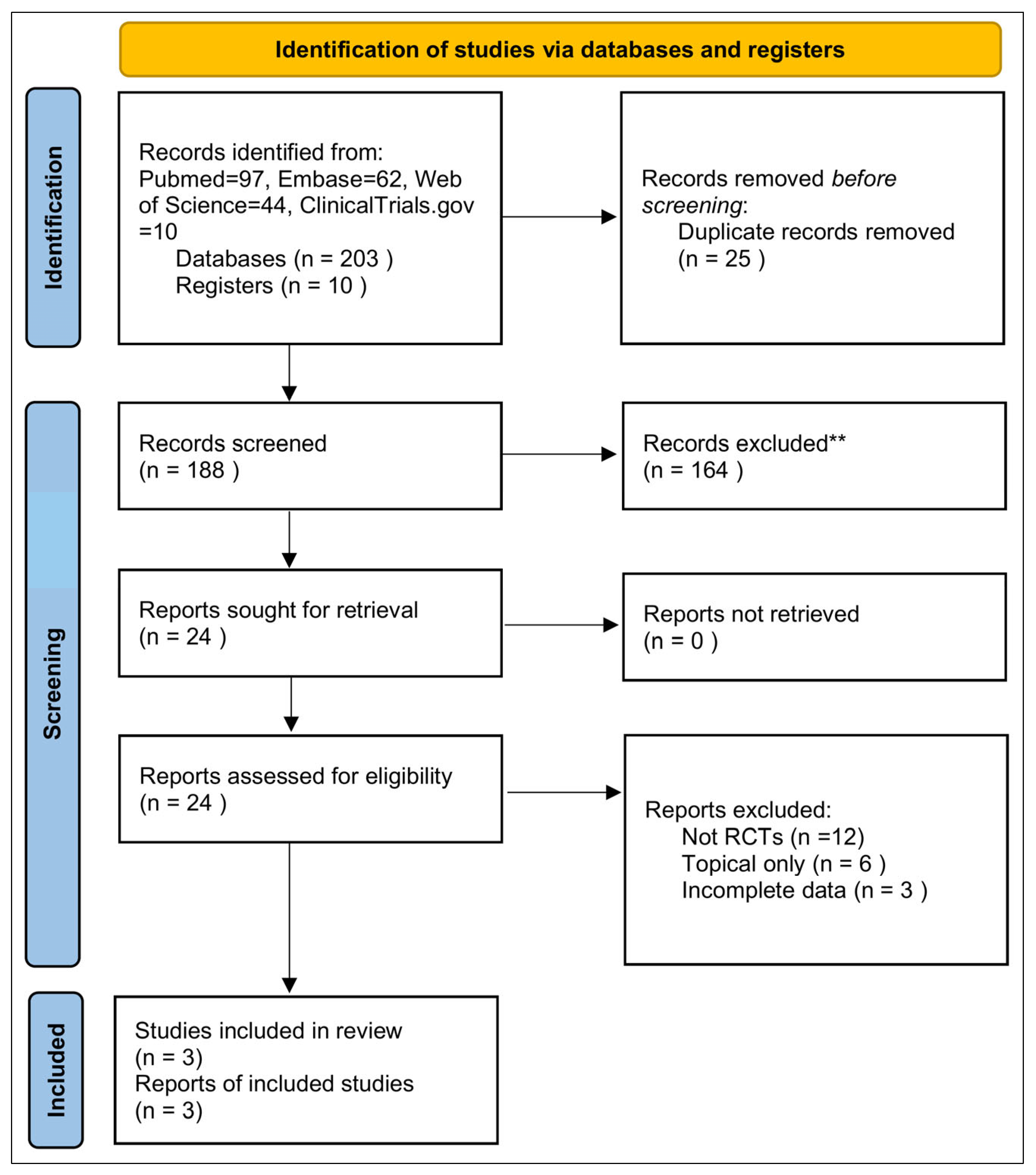 All excluded full-text reports are listed in Supplementary Table S1 [3,18,26,27,28,29,43,44,45,46,47,48,49,50,51,52,53,54,55,56,57]. Reasons for exclusion were: Not RCTs (n = 12), Topical only (n = 6), and Incomplete data (n = 3).