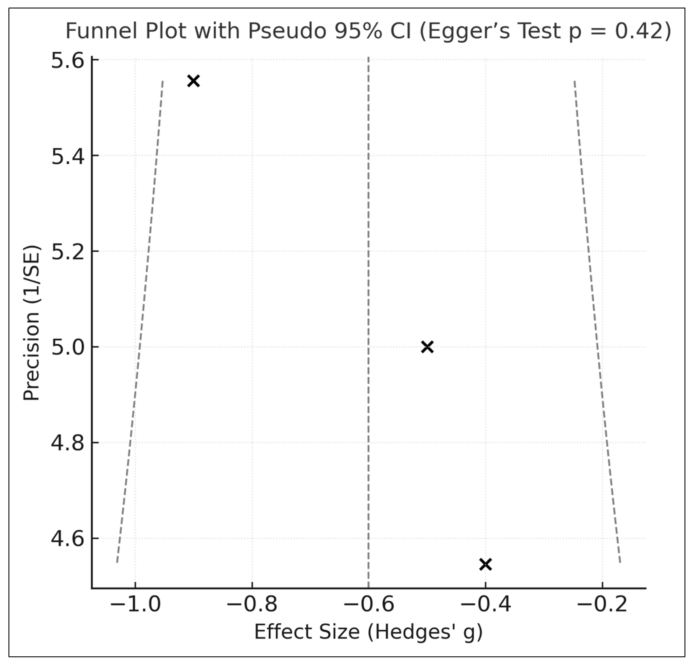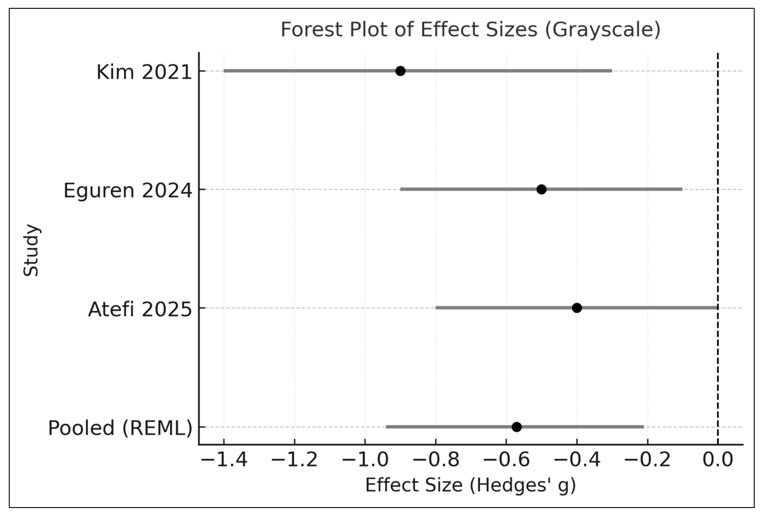 Applying the conventional DerSimonian–Laird estimator yielded a similar pooled effect (SMD −0.58), although this method is known to underestimate between-study variance when the number of trials is small. The agreement in direction and magnitude provides supportive—but not definitive—evidence of estimator robustness.