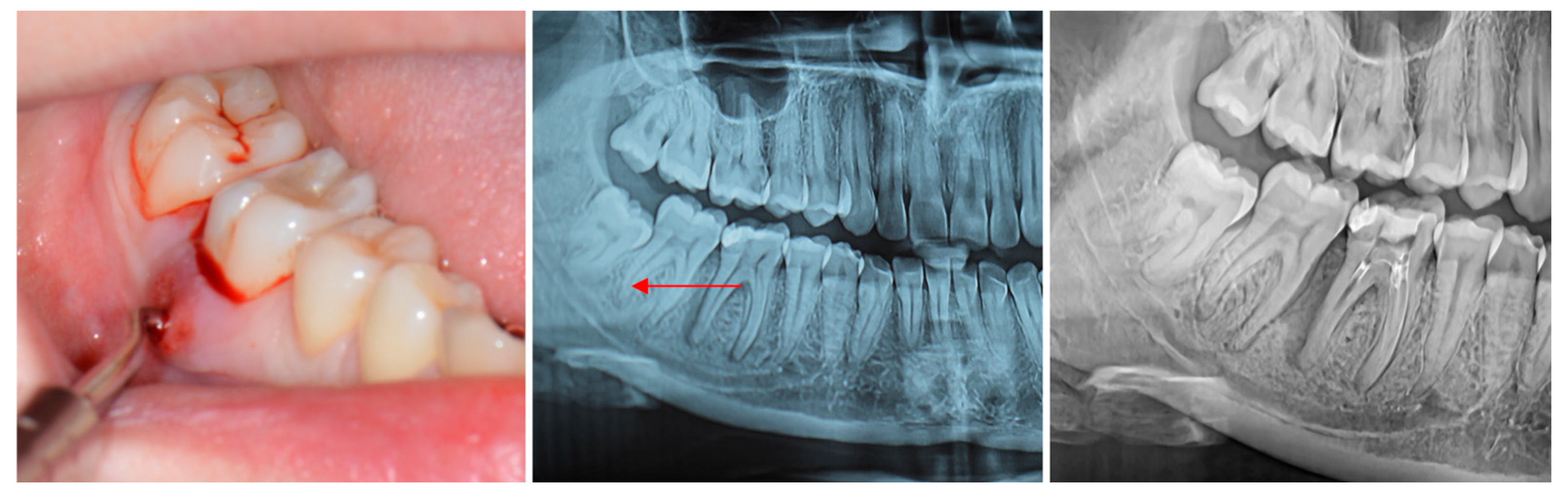Figure 1. Clinical and radiographic findings of an endo-periodontal lesion of a lower first molar. The intraoral photograph (left) demonstrates localized gingival inflammation and bleeding upon probing in the molar region. The periapical radiograph (center) reveals baseline vertical alveolar bone loss adjacent to the affected tooth (indicated by the red arrow). The third radiographic view (right) shows advanced periodontal bone destruction post-treatment, evidence of failed conventional treatment.