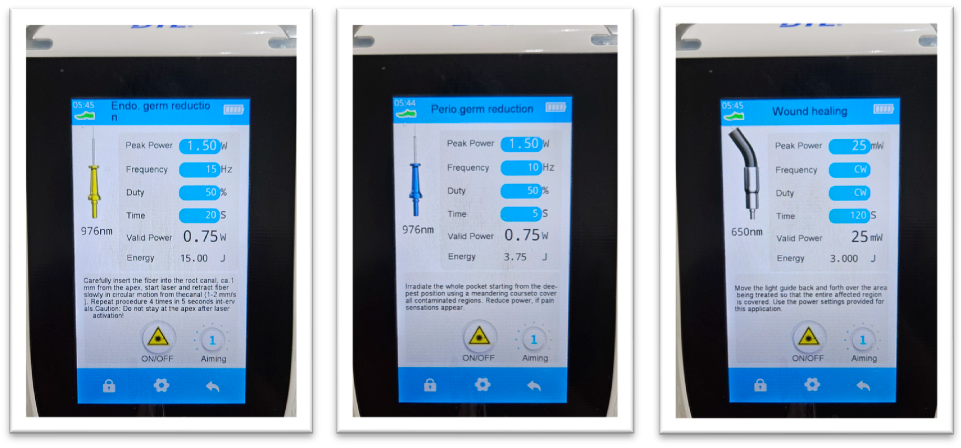Figure 2. Laser device settings used for different phases of our protocol: endodontic germ reduction, periodontal germ reduction and photobiomodulation.