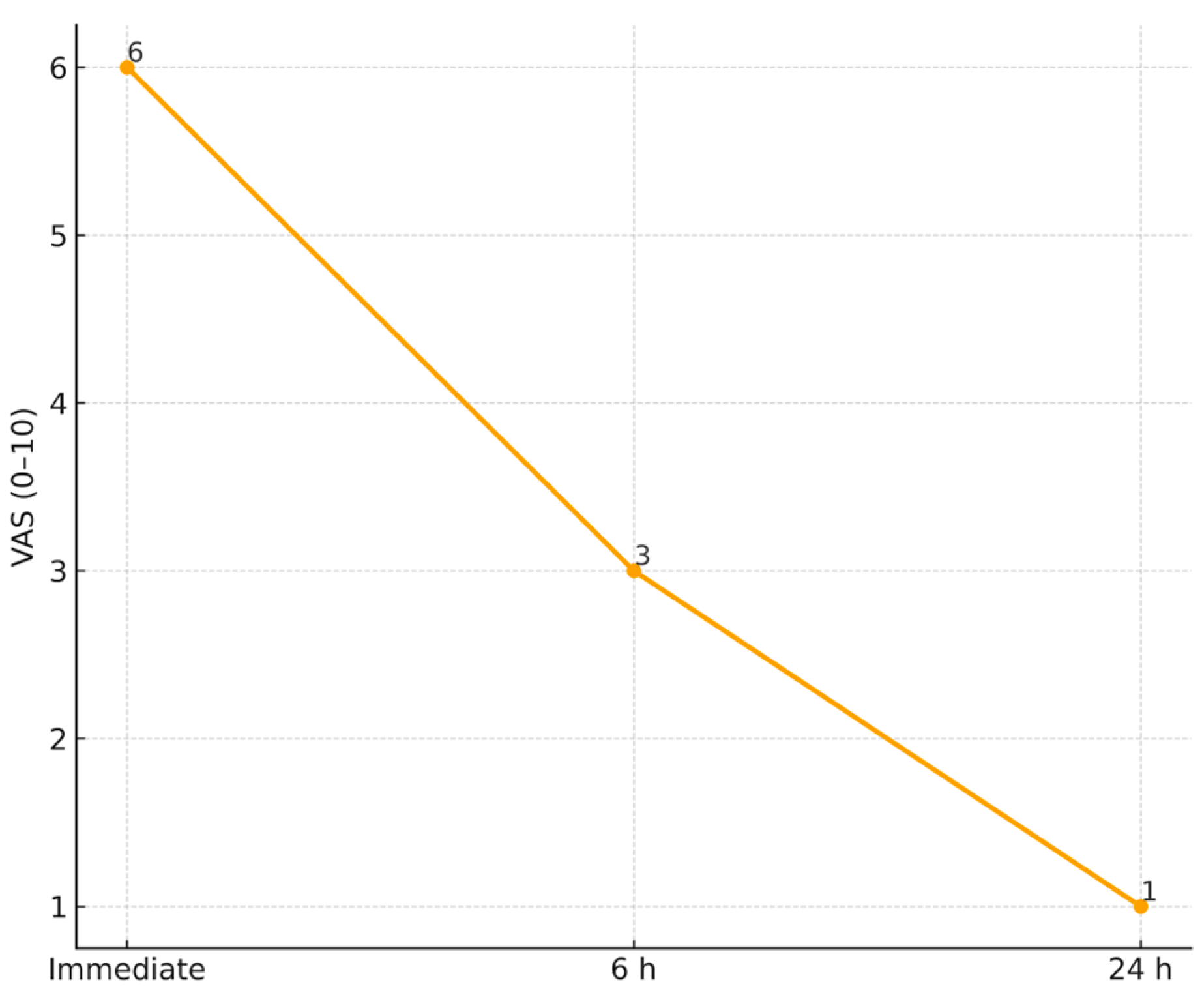 VAS pain score (0–10)moderate–severemild at 24 hwithin-patient reduction only (non-comparative)