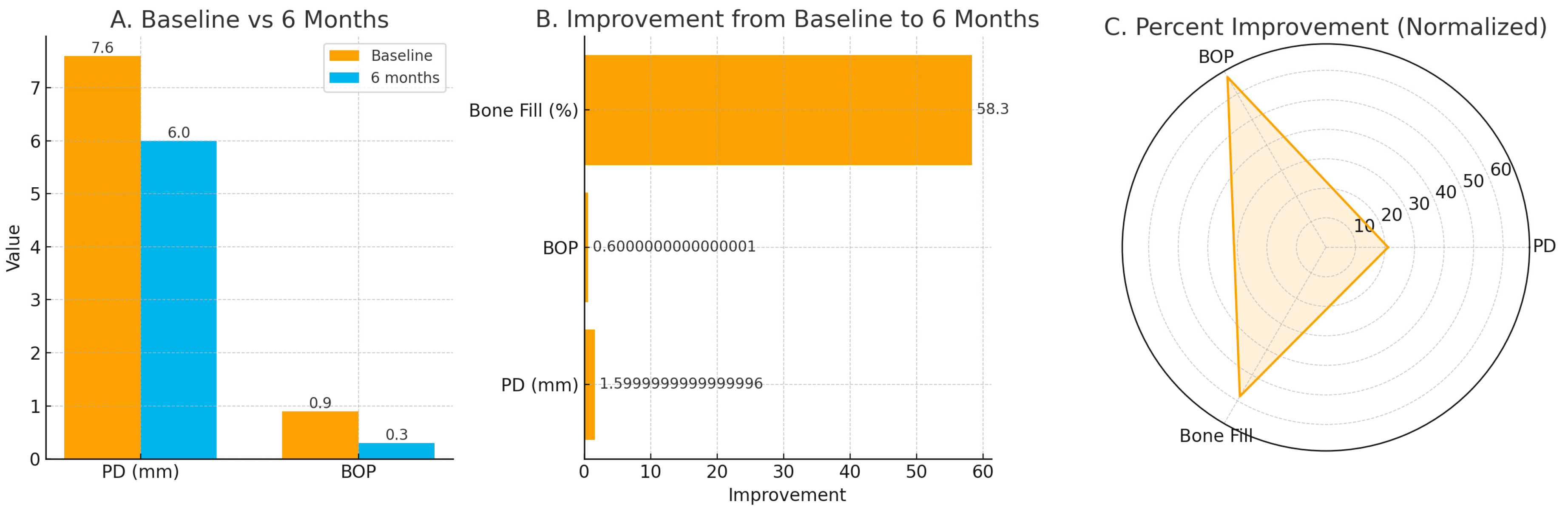 Figure 5. Composite panel illustrating clinical, radiographic, and patient-reported outcomes from baseline to 6 months in this case series of endodontic-periodontal lesions (n = 12). (A) Baseline vs. 6-month comparison of probing depth (PD) and bleeding on probing (BOP), presented as descriptive values using the study medians. (B) Horizontal improvement plot showing within-patient changes: PD reduction (−1.6 mm), BOP reduction (−0.6), and radiographic bone fill (+58.3 percent), displayed as positive improvement values. (C) Normalized spidergram illustrating relative percent improvements across PD, BOP, and bone fill.