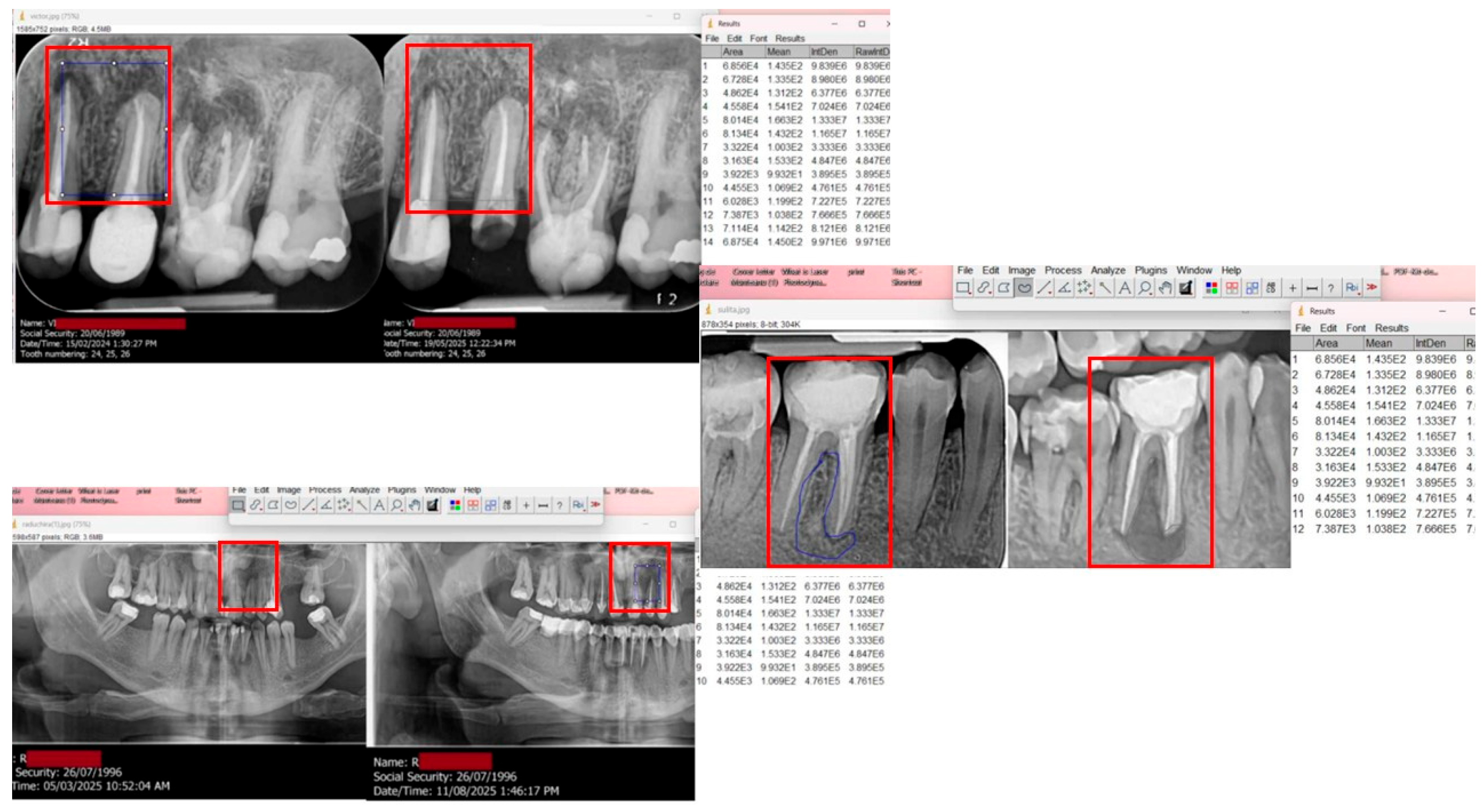 Digital images were imported into ImageJ (v1.53), and calibration was performed using a known reference length (the measured canal length), establishing a pixel-to-millimeter conversion factor for subsequent measurements. A rectangular region of interest (ROI) was placed over the apical radiolucency, defined by the borders of the lesion at baseline and replicated at the six-month follow-up using the ROI Manager tool. Bone fill was quantified by comparing the radiolucent area (mm2) between time points.
