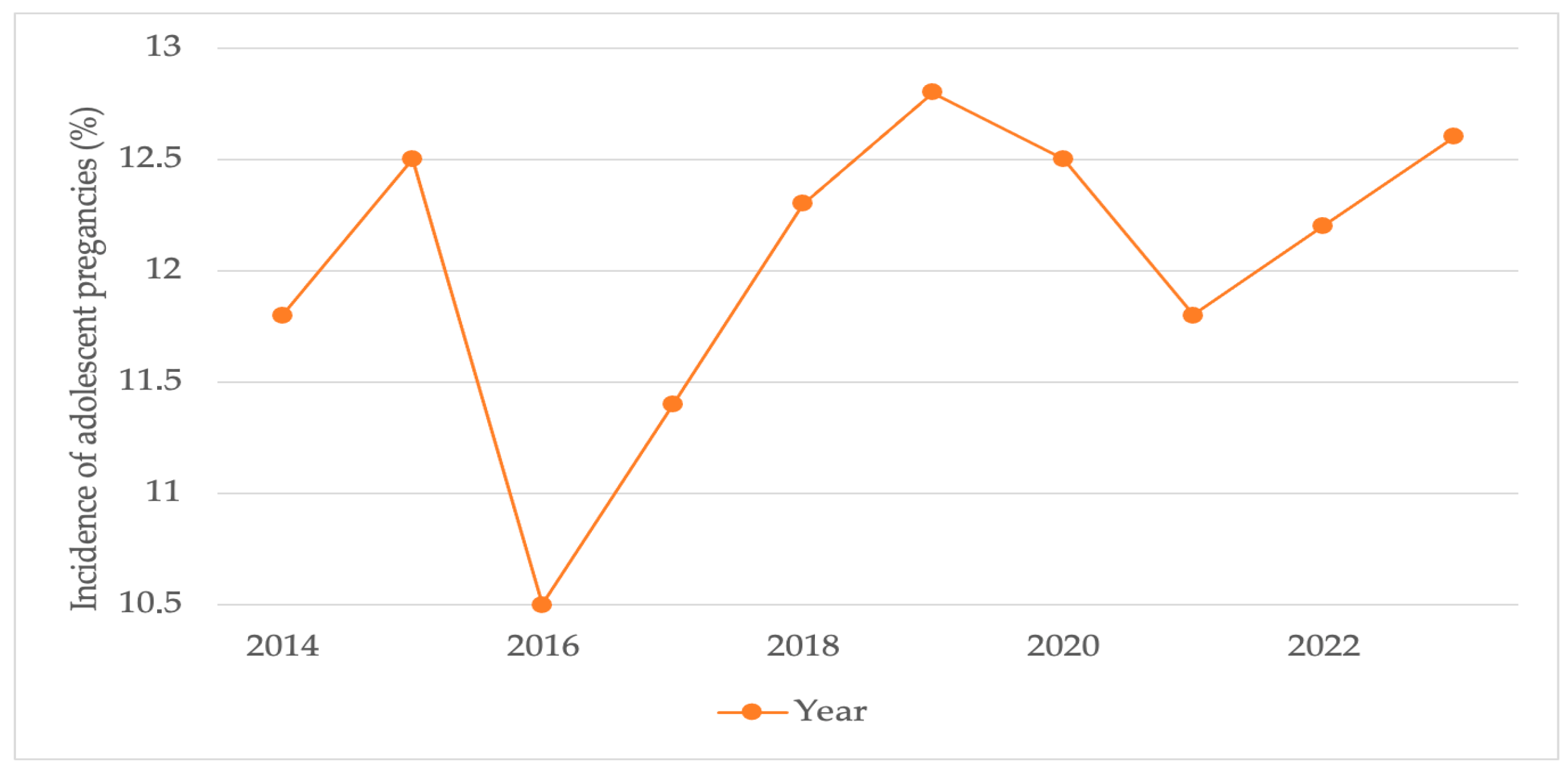 Data were extracted from institutional birth records (2014–2023). The incidence was calculated as the proportion of teenage deliveries (<19 years) relative to total annual births. The χ2 test for trend revealed no significant variation across years (χ2 = 3.1, p = 0.96).