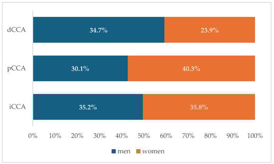 Distribution of cholangiocarcinoma subtypes by sex. (dCCA—distal cholangiocarcinoma; pCCA—perihilar cholangiocarcinoma; iCCA—intrahepatic cholangiocarcinoma).