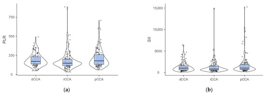 (a) Distribution of PLR by cholangiocarcinoma localization. (Dwass-Steel-Critchlow-Fligner pairwise comparisons: p-value = 0.011 for iCCA vs. pCCA, p-value = 0.067 for iCCA vs. dCCA, p-value = 0.752 for pCCA vs. dCCA). (b) Distribution of SII by cholangiocarcinoma localization. (Dwass-Steel-Critchlow-Fligner pairwise comparisons: p-value = 0.05 for iCCA vs. pCCA, p-value = 0.433 for iCCA vs. dCCA, p-value = 0.759 for pCCA vs. dCCA; iCCA—intrahepatic; pCCA—perihilar; dCCA—distal cholangiocarcinoma).