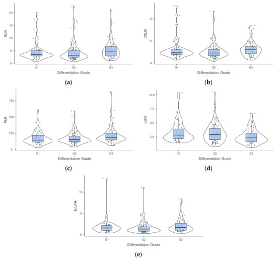 Distribution of values associated with evaluated lymphocyte-related biomarkers by differentiation grade of the cholangiocarcinoma. Post hoc analysis (a) NLR—neutrophil-to-lymphocyte ratio: p = 0.020 G2 vs. G3; (b) dNLR—derived neutrophil-to-lymphocyte ratio: p = 0.033 G2 vs. G3; (c) PLR—platelet-to-lymphocyte ratio: p = 0.036 G1 vs. G3, and p = 0.021 G2 vs. G3; (d) LMR—lymphocyte-to-monocytes ratio: p = 0.025 G1 vs. G3, and p = 0.035 G2 vs. G3; (e) N/LPR—neutrophil-to-lymphocyte and platelet ratio: p = 0.030 G2 vs. G3.