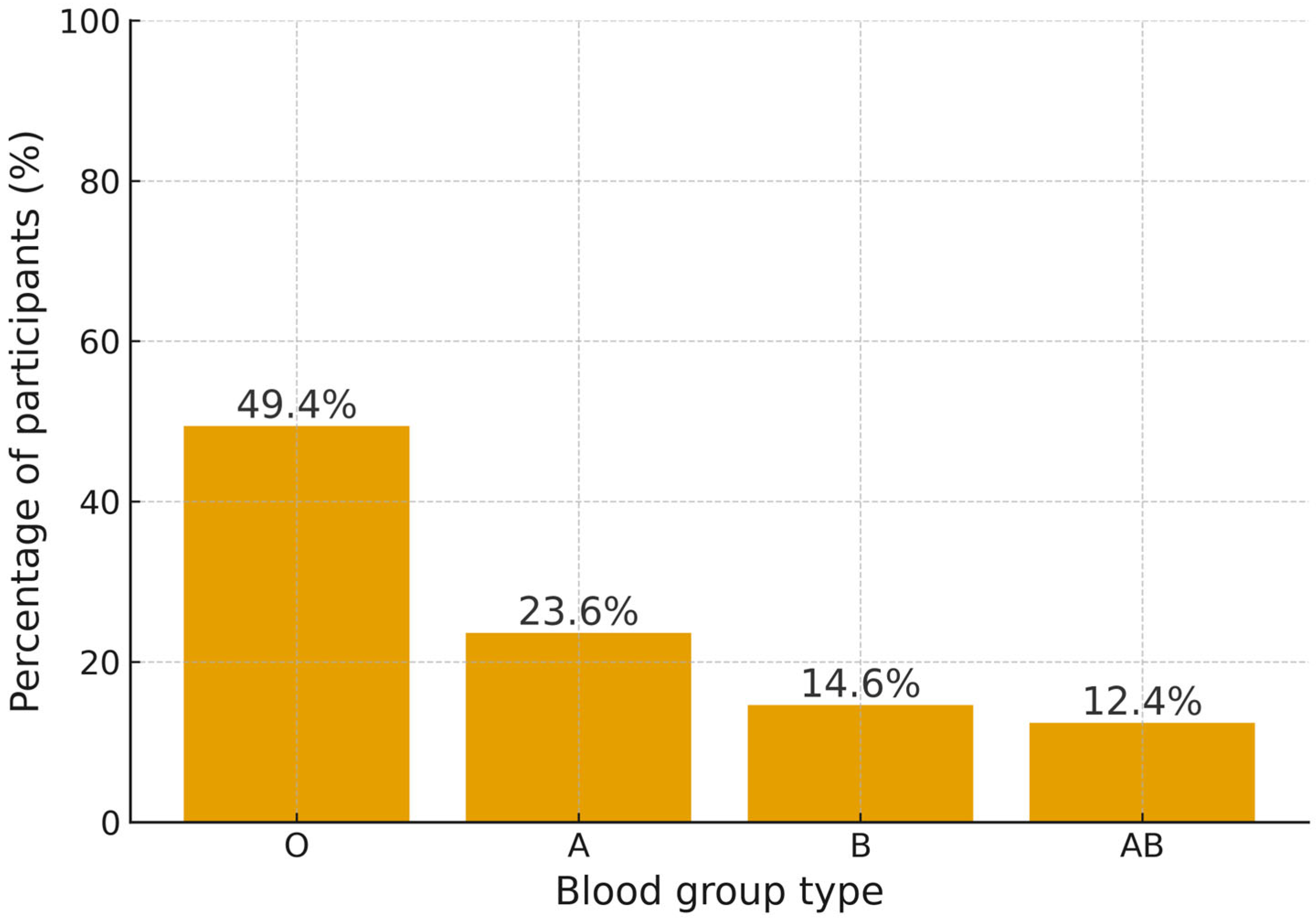 Standardized hemagglutination tests were used to determine ABO blood group antigens using anti-A, anti-B, anti-AB, and anti-D monoclonal antibodies, while adhering to the manufacturer’s recommended procedure (Bio-Rad, Hercules, CA, USA).