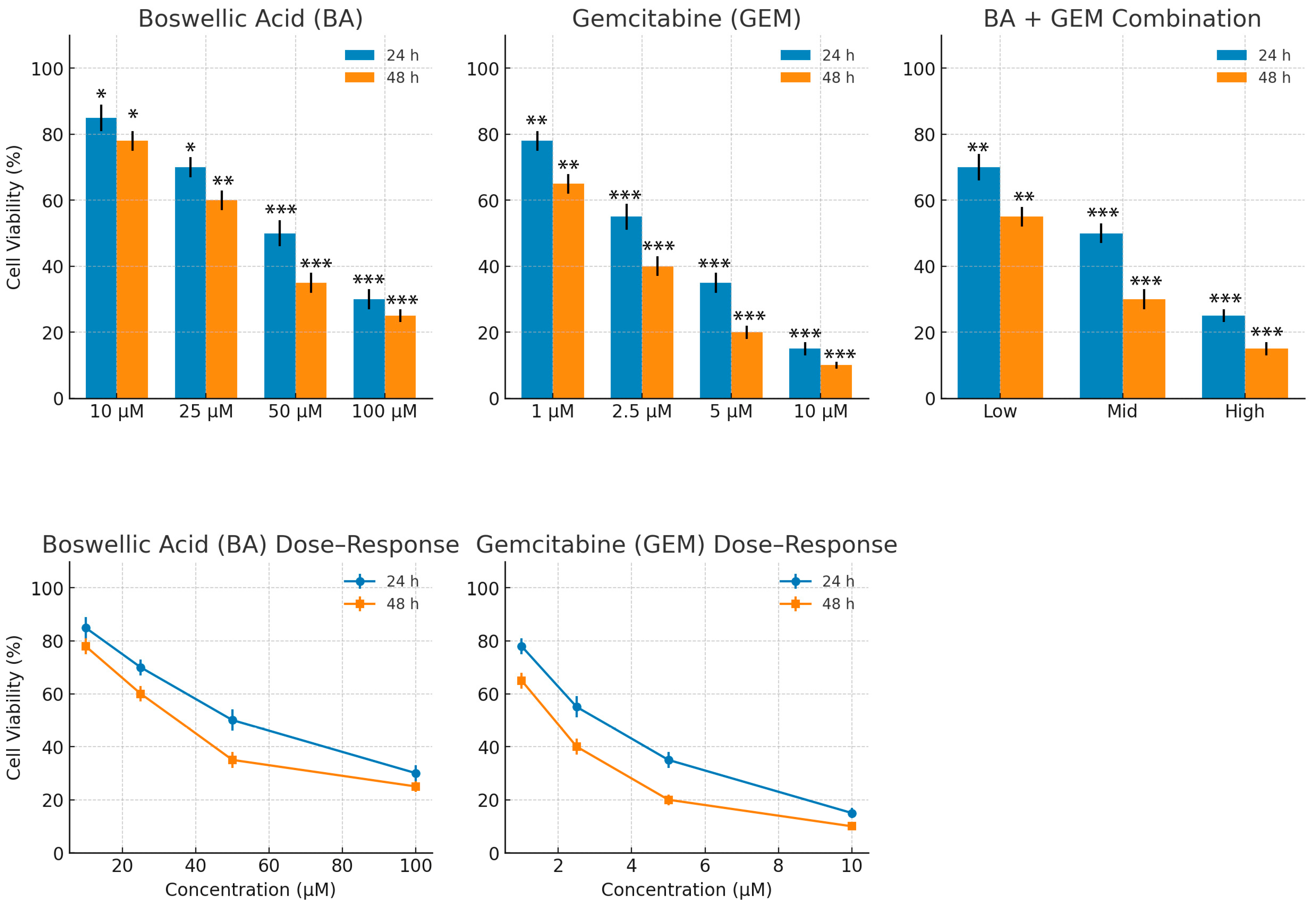 MTT assays demonstrated that BA significantly reduced cell viability at doses of 25 µM and above after 24 h of treatment, whereas it became effective at concentrations as low as 10 µM after 48 h. GEM exerted a much stronger cytotoxic effect at lower doses, with significant reductions in viability observed starting at 1 µM and an IC