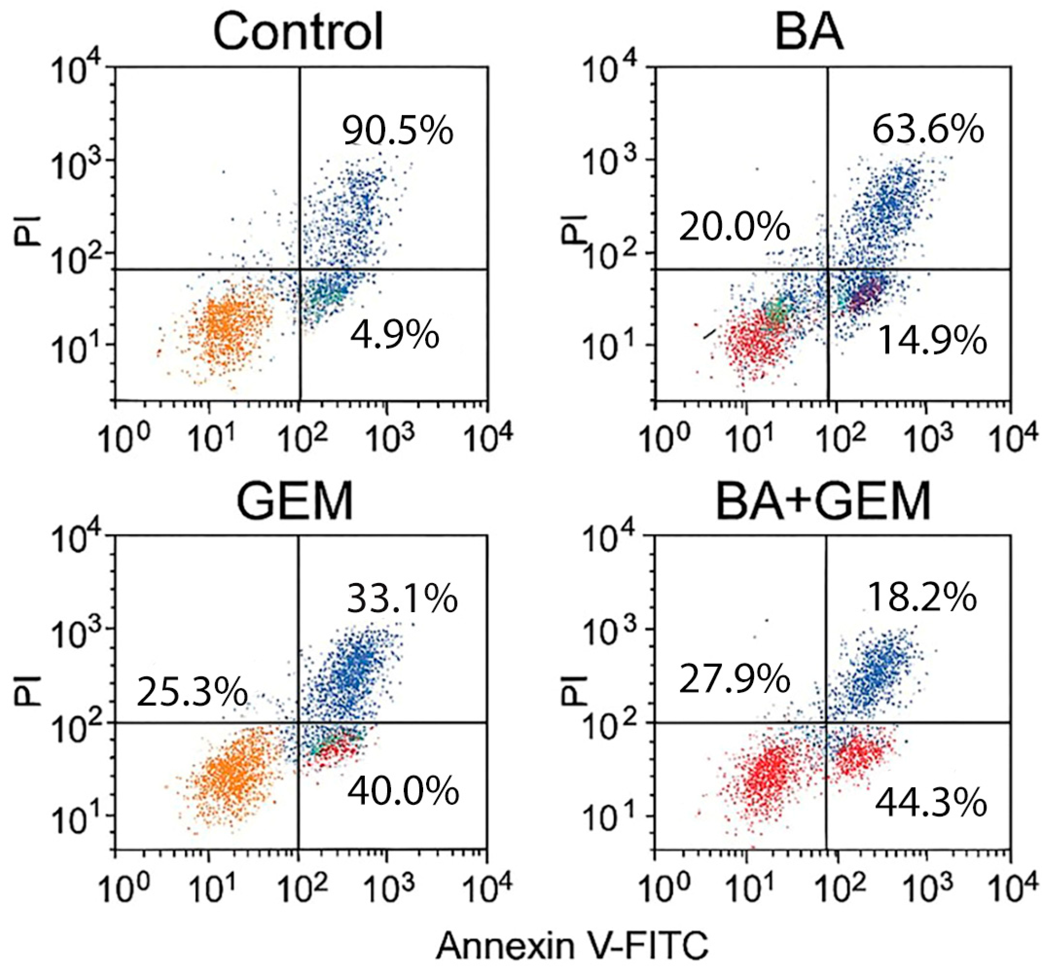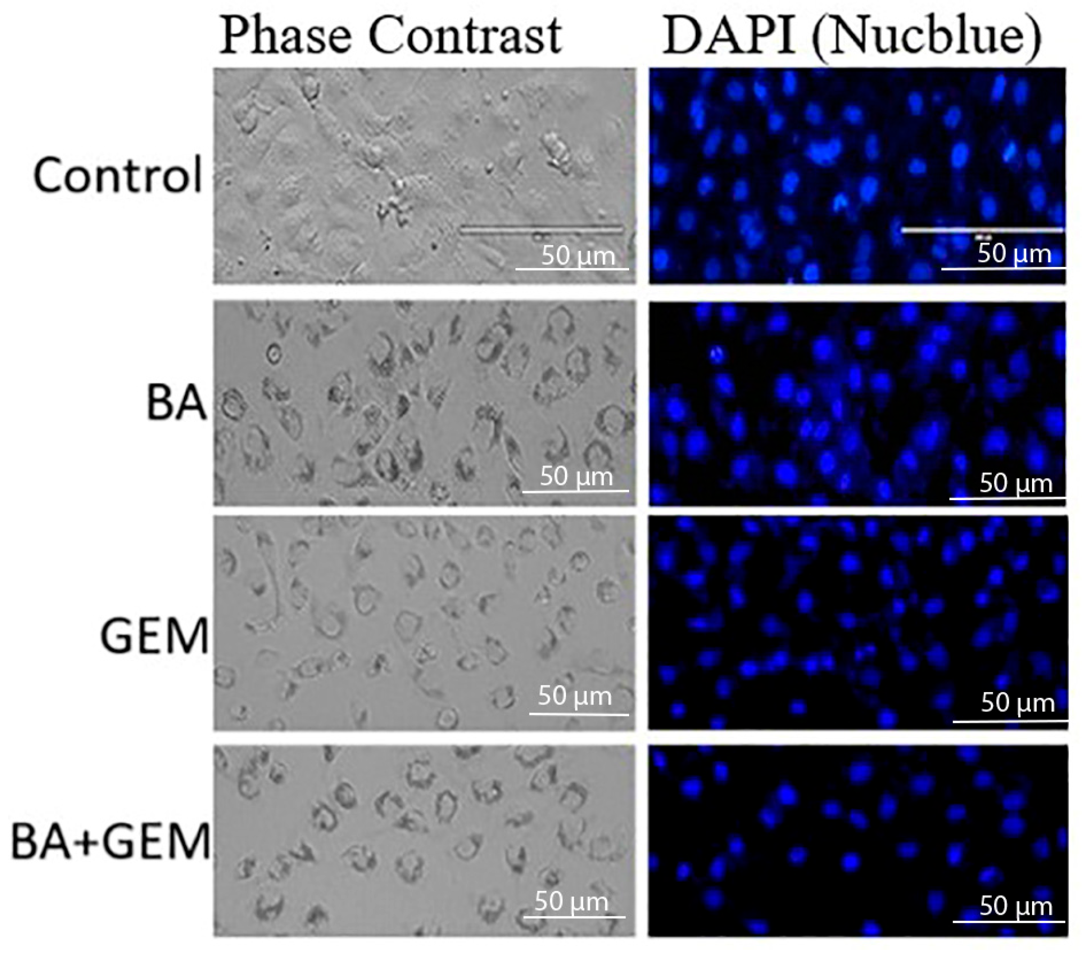 18]. Although the morphological alterations between GEM and BA + GEM groups appeared modest under phase-contrast microscopy, quantitative assays (MTT, Annexin V/PI, and Caspase-3/7 analyses) consistently demonstrated enhanced cytotoxicity and apoptosis with combination treatment, corroborating the observed microscopic trends.