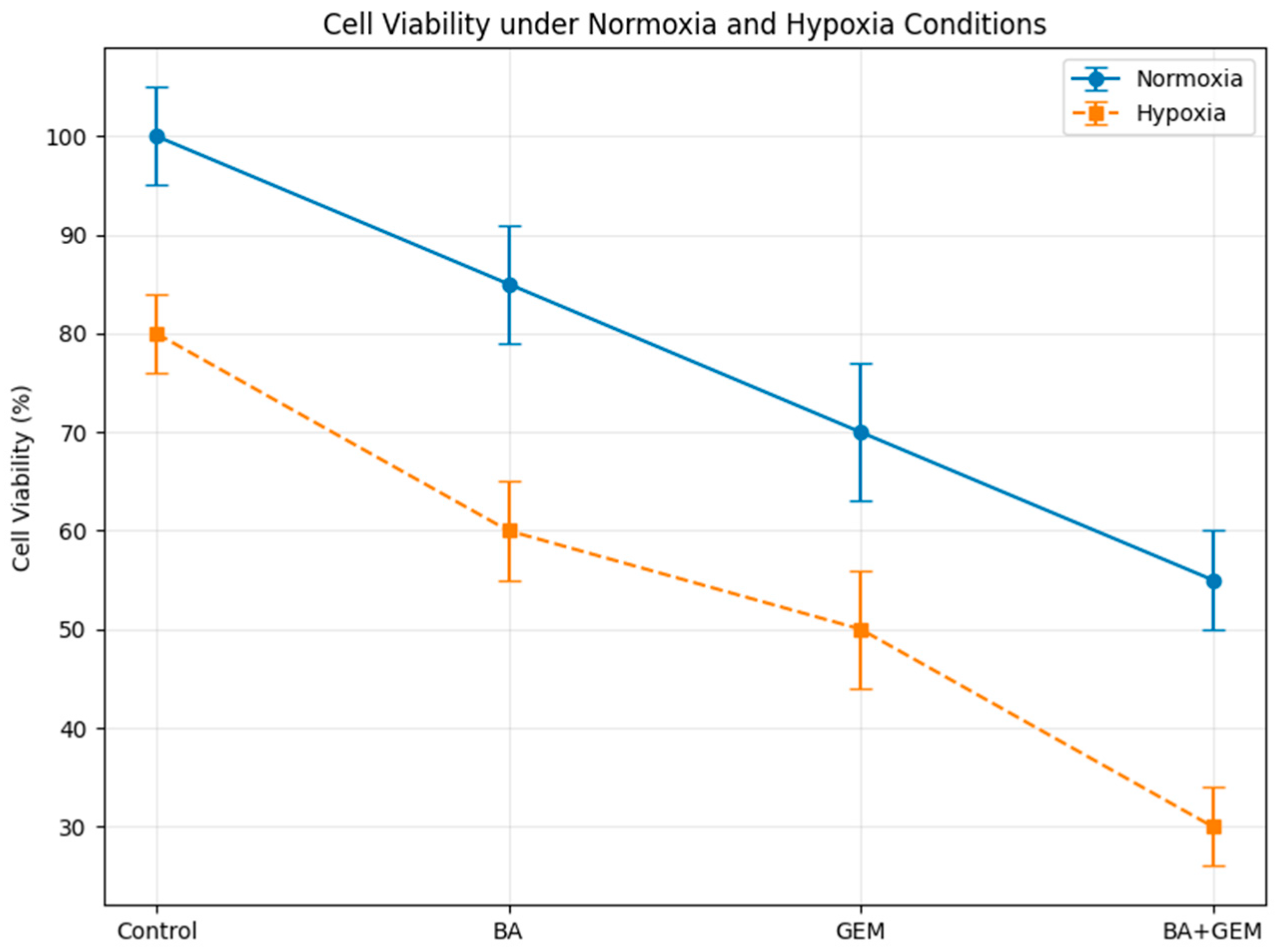 Based on these considerations, the present study investigated the effects of BA and GEM, individually and in combination, on key molecular pathways driving endometrial cancer progression. Unlike our previous investigations involving flavonoid-based compounds such as hesperidin in combination with chemotherapeutics, this study introduces BA (a pentacyclic triterpenoid) as a structurally and mechanistically distinct natural agent. Furthermore, the experiments were performed under hypoxic conditions (1% O2) to closely mimic the tumor microenvironment and to explore the modulation of HIF-1α/VEGF signaling, which was not evaluated in our earlier normoxic studies.