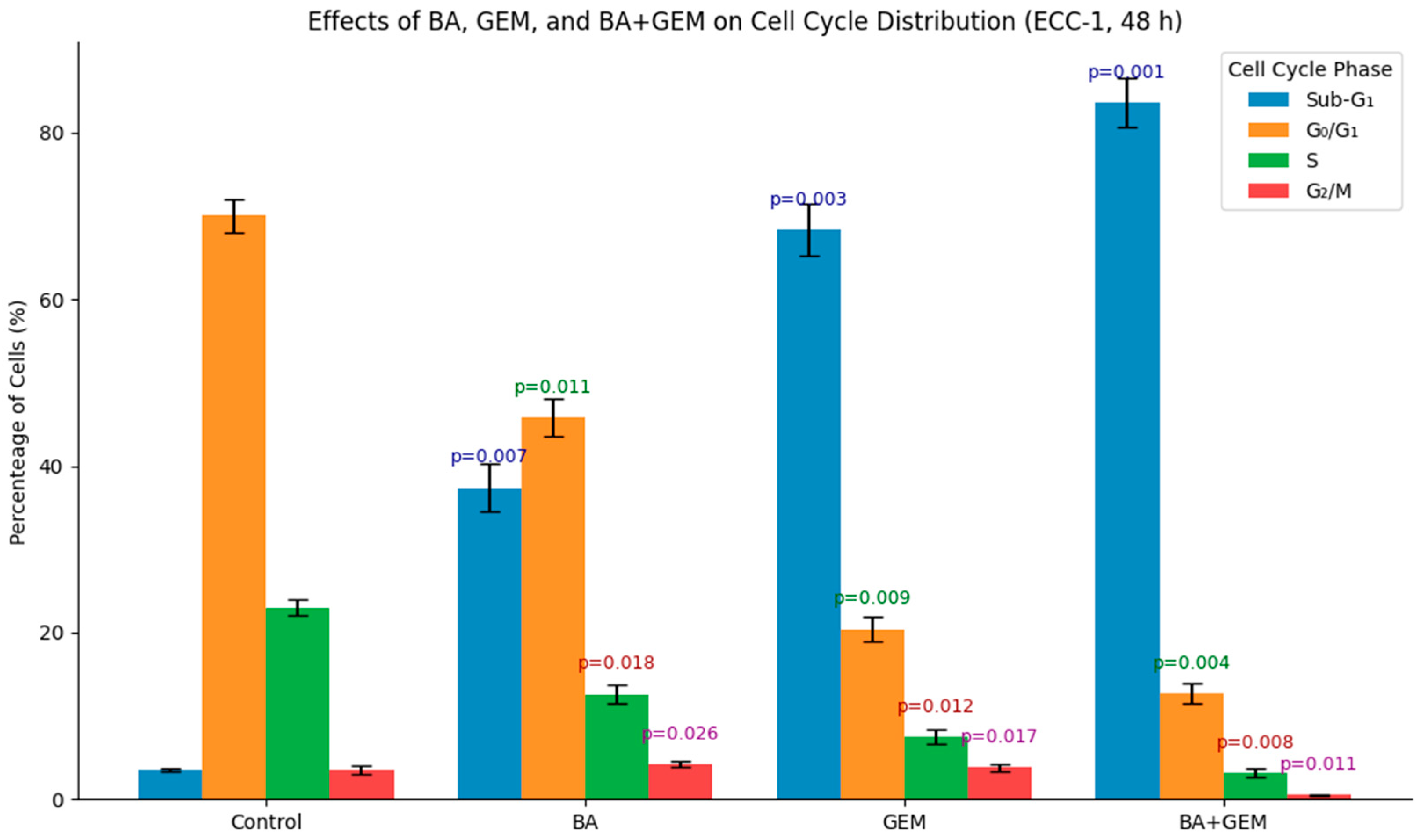 Apoptotic cell death was further evaluated using an Annexin V-FITC/Propidium Iodide (PI) Apoptosis Detection Kit (BD Biosciences, San Jose, CA, USA), following the manufacturer’s instructions. ECC-1 cells were seeded in 6-well plates (Corning Inc., Corning, NY, USA) and treated with BA, GEM, or their combination at IC50 concentrations for 48 h. After treatment, cells were harvested, washed twice with cold phosphate-buffered saline (PBS; Gibco, Thermo Fisher Scientific, Waltham, MA, USA), and resuspended in binding buffer. Annexin V-FITC and PI were added, and the samples were incubated for 15 min at room temperature in the dark. Fluorescence signals were analyzed with a BD FACSCanto™ II flow cytometer (BD Biosciences, San Jose, CA, USA), and data were processed using FlowJo software version 10 (BD Biosciences, Ashland, OR, USA). Cells were classified as viable (Annexin V−/PI−), early apoptotic (Annexin V+/PI−), late apoptotic (Annexin V+/PI+), or necrotic (Annexin V−/PI+). All experiments were performed in triplicate (n = 3).