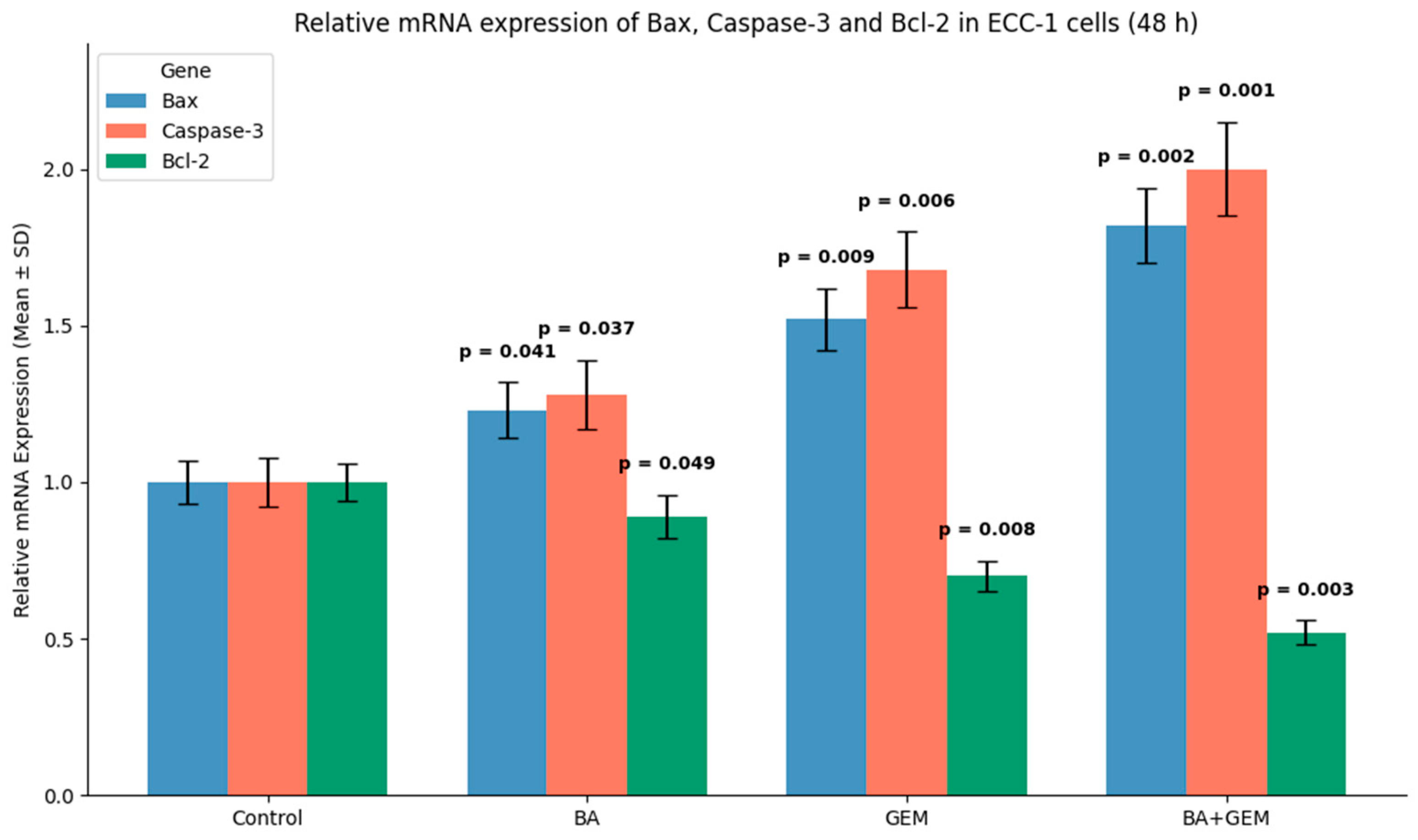 Analysis of apoptosis-related gene expression further supported these findings. BA treatment slightly increased Bax and Caspase-3 levels while decreasing Bcl-2 expression, consistent with studies showing that betulinic acid suppresses tumor growth through activation of mTOR-regulated apoptotic signaling and modulation of the Bax/Bcl-2/caspase axis. Likewise, GEM significantly upregulated Bax and Caspase-3 while downregulating Bcl-2, in line with findings demonstrating that gemcitabine induces apoptotic cell death in uveal melanoma cells by elevating Bax, activating cleaved Caspase-3, and altering Bcl-2 levels and that inhibition of Bcl-2 enhances GEM sensitivity. The BA + GEM combination maximized Bax and Caspase-3 expression and strongly reduced Bcl-2 expression, indicating that the combination therapy robustly activated mitochondrial-mediated apoptosis [