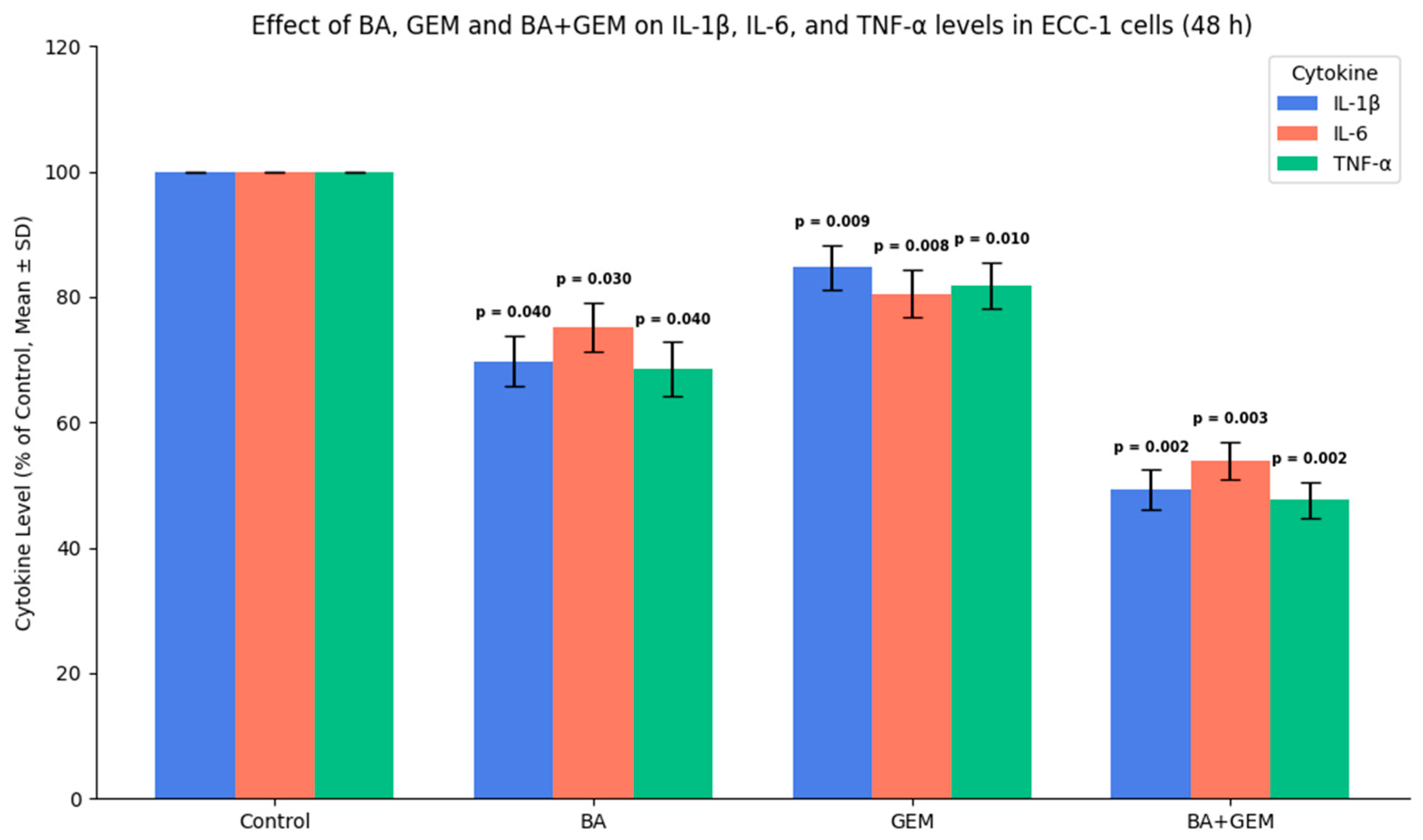 19]. Since IL-1β, IL-6, and TNF-α are well-established mediators of tumor-associated inflammation, their downregulation is mechanistically relevant. Elevated levels of these cytokines are known to promote tumor cell proliferation, angiogenesis, epithelial–mesenchymal transition (EMT), and resistance to apoptosis through activation of NF-κB and STAT3 signaling pathways. Therefore, the observed decrease in cytokine levels suggests that BA and GEM may impair these oncogenic pathways, thereby attenuating the pro-tumorigenic microenvironment.