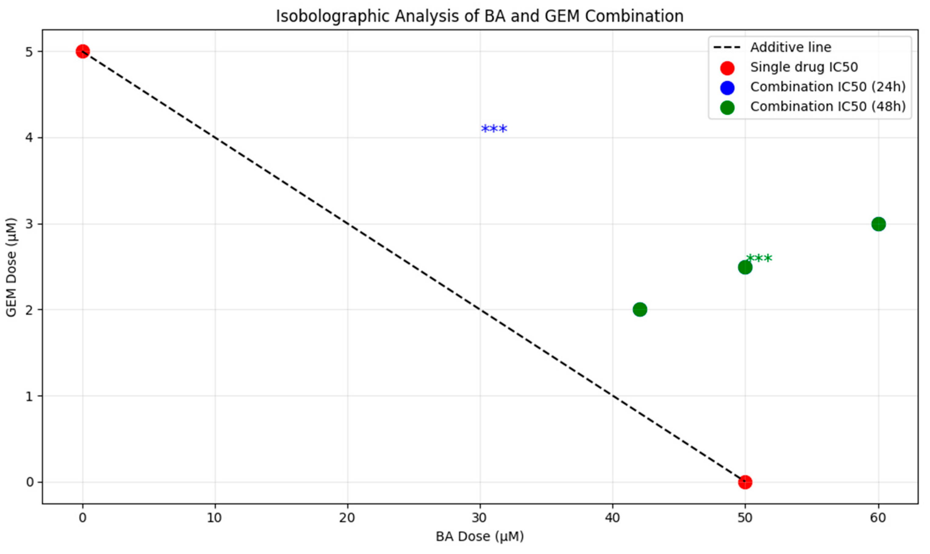 Drug interaction effects between BA and GEM were evaluated using the Chou–Talalay method. Combination index (CI) values were calculated based on the median-effect equation with CompuSyn software version 1.0 (ComboSyn Inc., Paramus, NJ, USA). CI < 1.0 indicated synergism, CI = 1.0 indicated additivity, and CI > 1.0 indicated antagonism. Isobologram plots were generated to visualize the nature of the drug interactions.
