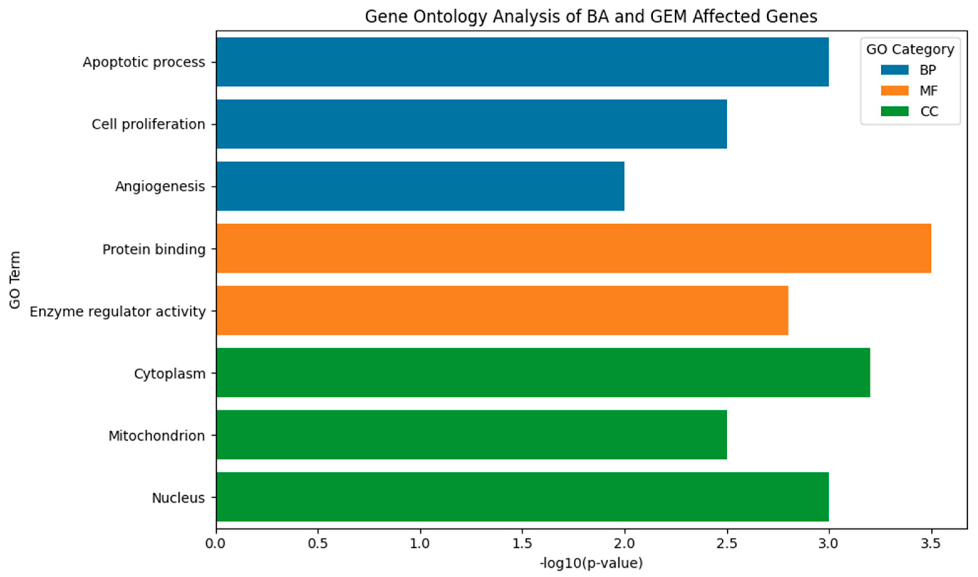 Gene Ontology (GO) analysis revealed that treatment-associated genes were significantly enriched in three main categories: biological processes, molecular functions, and cellular components. Within the biological process category, genes modulated by BA and GEM were primarily involved in apoptosis, cell proliferation, and angiogenesis, underscoring their role in suppressing tumor growth and progression. The upregulation of pro-apoptotic genes (e.g., Bax and Caspase-3) together with the downregulation of anti-apoptotic and pro-angiogenic genes (e.g., Bcl-2, VEGF, and HIF-1α) highlights a coordinated reprogramming of cellular fate toward apoptosis and reduced vascular support. At the molecular function level, enrichment in protein binding, enzyme regulator activity, and signal transduction pathways indicates that BA and GEM interfere with key signaling cascades responsible for sustaining malignant phenotypes. These functions are particularly relevant to pathways such as NF-κB, STAT3, and PI3K/Akt, which regulate cell survival, inflammatory signaling, and angiogenesis. For cellular components, gene enrichment was concentrated in the cytoplasm, mitochondria, and nucleus—organelles central to apoptosis and transcriptional regulation. The mitochondrial localization of Bax and Caspase-3 is consistent with the activation of intrinsic apoptotic pathways, while nuclear changes suggest alterations in transcriptional programs related to angiogenesis and cell survival. Collectively, these findings demonstrate that BA and GEM target interconnected molecular networks at multiple cellular levels, thereby exerting a potent anticancer effect. Importantly, the combination treatment amplifies these effects, suggesting a systems-level reprogramming of tumor biology that may underlie the observed synergistic cytotoxicity [