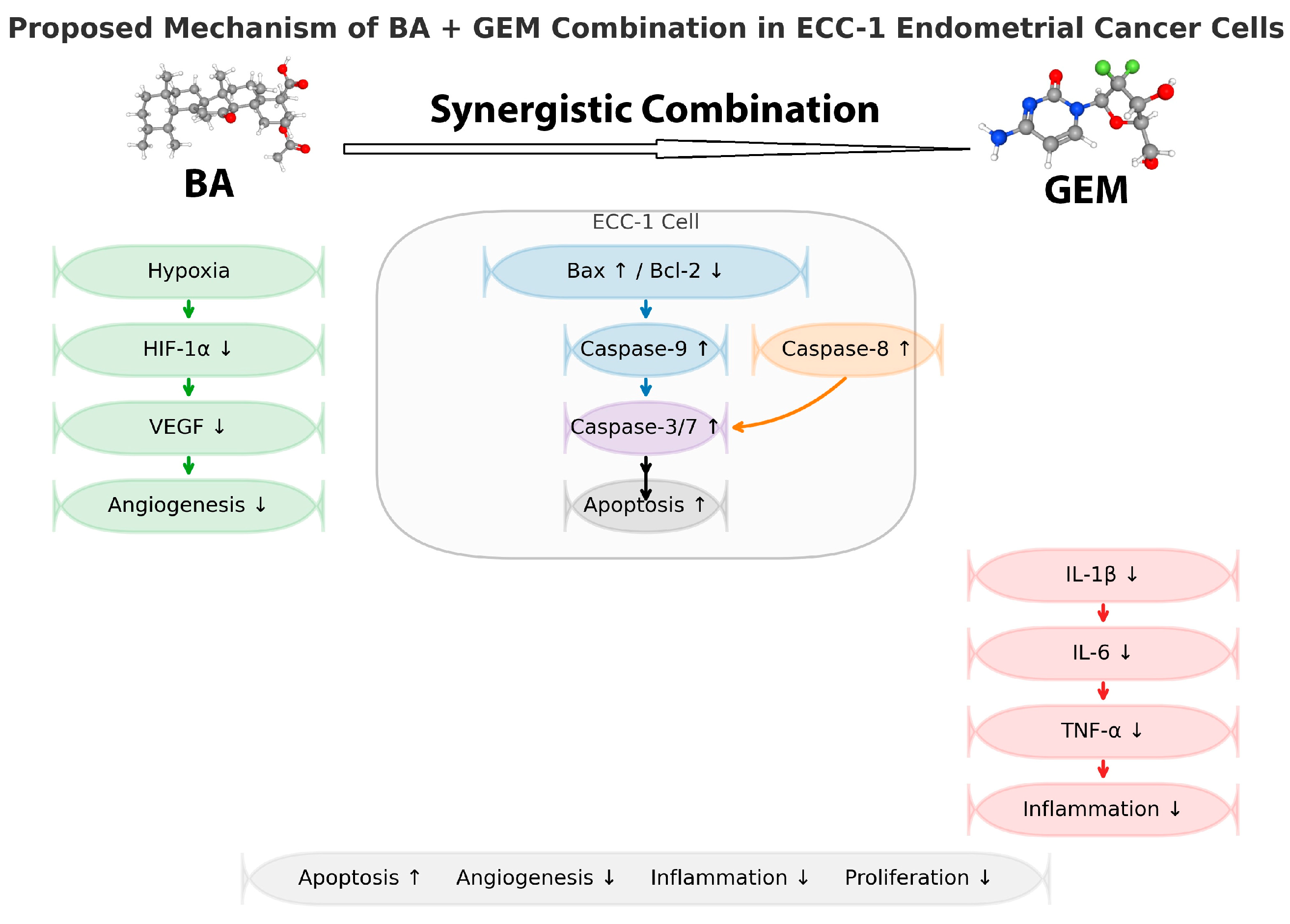This study provides important mechanistic insights into the synergistic anticancer effects of BA and GEM in ECC-1 endometrial cancer cells. The ECC-1 line was chosen because it represents a well-differentiated, estrogen-responsive endometrial carcinoma subtype that stably expresses key apoptotic and angiogenic markers such as HIF-1α, VEGF, Bax, and Bcl-2, making it an appropriate model for hypoxia-related investigations. The synergistic combination of BA and GEM significantly suppressed HIF-1α and VEGF expression, enhanced Bax and Caspase-3/7 activation, and decreased Bcl-2 levels, collectively confirming the involvement of both intrinsic and extrinsic apoptotic pathways.