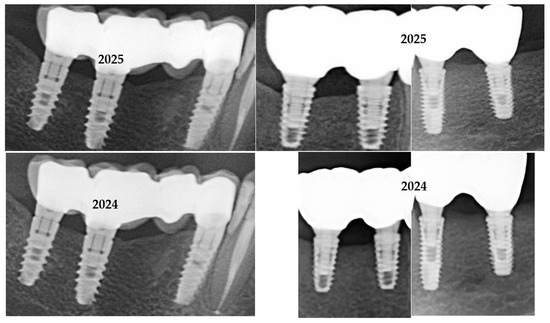 Marginal adaptation was initially assessed for all cases using conventional two-dimensional (2D) periapical and panoramic radiographs (Figure 7). Due to the intrinsic resolution limitations of these imaging modalities—approximately 150 μm for panoramic imaging and 75 μm for CBCT scans—precise quantitative measurements of marginal gaps could not be reliably performed using radiographs alone. No gross misfits, open margins, or overhanging contours were detected in any of the reviewed images, and all restorations were classified as radiographically acceptable, without apparent marginal discrepancies linked to early failure or peri-implant inflammation.