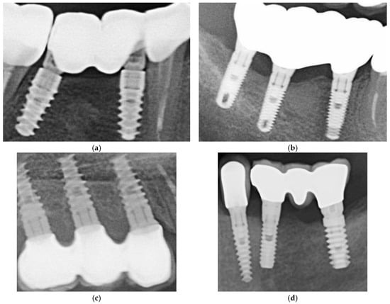 A total of 40 patients were selected for inclusion based on strict eligibility criteria. Patients were required to have complete clinical and radiographic documentation, including orthopantomography (OPG), cone beam computed tomography (CBCT), intraoral photographs, and follow-up records. Implants from Bredent, MIS, MegaGen, and Straumann systems were included. Definitive abutments were torqued following the standard protocol recommended by each manufacturer, and all restorations were delivered as cement-retained partial prostheses supported by 2–3 implants, with spans ranging from 2 to 4 elements. Non-smokers and light smokers (≤5 cigarettes/day) were eligible, while heavy smokers were excluded. Exclusion criteria included uncontrolled systemic diseases (e.g., diabetes, osteoporosis), parafunctional habits (e.g., bruxism), progressive peri-implant bone loss at baseline, screw-retained restorations, and non-standardized cementation protocols. Standardized cementation protocol (required for inclusion) was defined as: isolation with cotton rolls/high-volume suction (rubber dam where feasible), abutment decontamination with chlorhexidine, substrate-specific surface pretreatment (Section 2.4.1), controlled cement application, and sequential excess removal (microbrush at margins → floss/interprox brushes interproximally → targeted ultrasonic tip at emergence profile), followed by immediate radiographic/clinical verification.