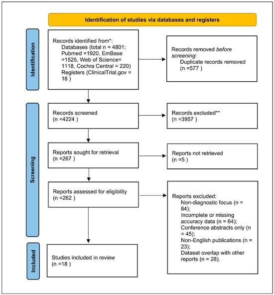 The database search yielded 4801 records, of which 4224 remained after deduplication. After title/abstract screening and full-text assessment, 18 studies published between 2020 and 2025 met the inclusion criteria. Reasons for exclusion included non-diagnostic focus, incomplete accuracy data, conference abstracts without quantitative reporting, non-English publications, or dataset overlap. The PRISMA 2020 flow diagram (Figure 1) follows PRISMA guidelines [7,16].