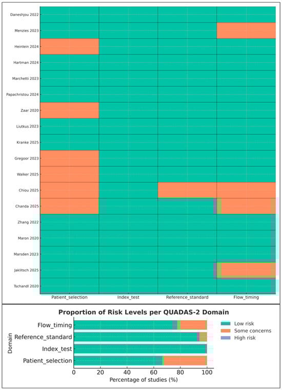 Risk of bias and applicability were assessed using QUADAS-2 [14], evaluating four domains: patient selection, index test, reference standard, and flow and timing. Two reviewers completed assessments independently; disagreements were resolved by consensus. Results are visually summarized using a standard QUADAS-2 traffic-light plot.