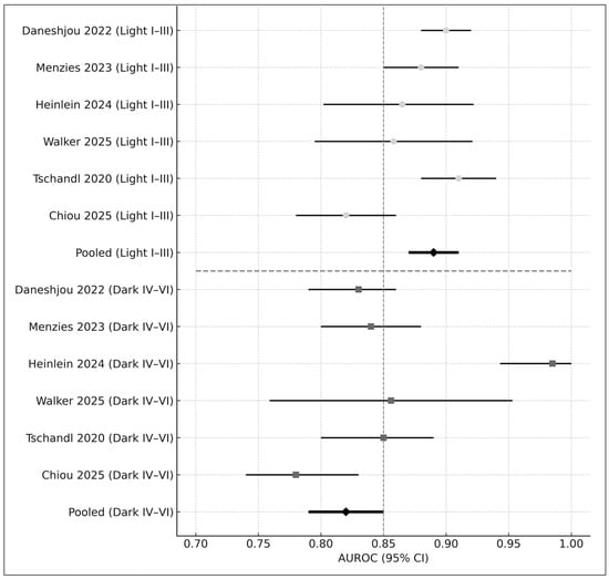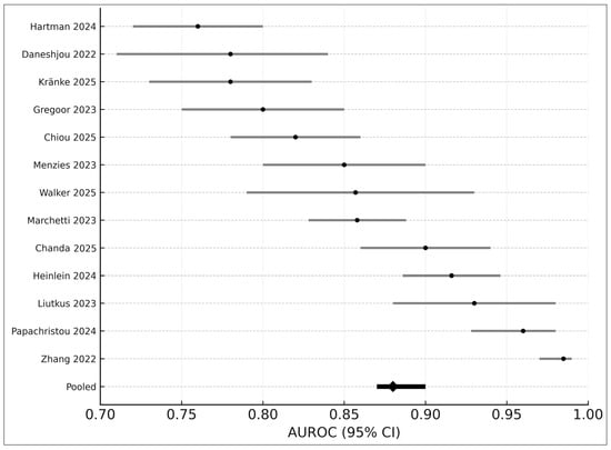 Studies reporting only AUROC values were synthesized using DerSimonian–Laird random-effects modeling [12], with variances derived from reported confidence intervals or calculated using the delta method.