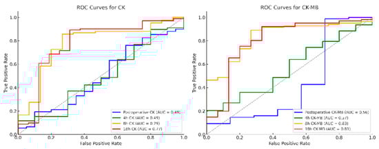 Receiver Operating Characteristic (ROC) curves for total CK and CK-MB levels measured at different timepoints after surgery (postoperative, 4 h, 8 h, and 18 h). Area under the curve (AUC) values are indicated in the legend. Abbreviations: CK, creatinine-kinase; CK-MB, creatinine-kinase myocardial band. Note: The dotted diagonal line represents the line of no discrimination (AUC = 0.5).