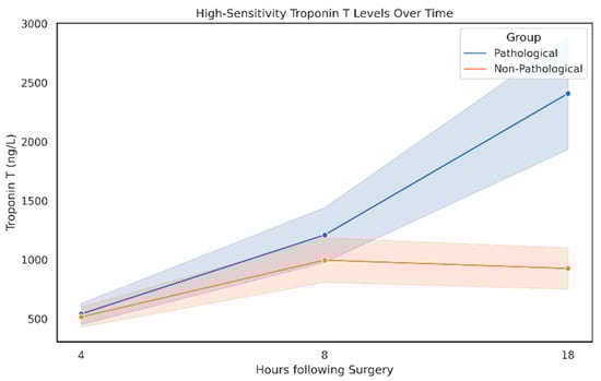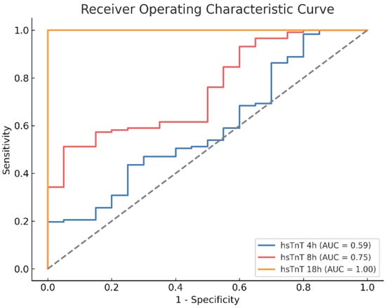 ROC analysis was conducted to evaluate the ability of high-sensitivity Troponin T (hsTnT) levels to distinguish between pathological findings and no identified findings at different time points (4 h, 8 h, and 18 h post-surgery). At 4 h, hsTnT exhibited limited discriminatory power (AUC = 0.59), indicating poor differentiation between the groups. By 8 h, its predictive accuracy improved (AUC = 0.75), suggesting a moderate ability to distinguish between patients with and without pathological findings. At 18 h, hsTnT demonstrated near-perfect separation (AUC = 1.00). The Youden Index analysis identified the optimal cutoff values, with thresholds of 641 ng/L for troponin measurement at 4 h, 1231 ng/L at 8 h, and 1608 ng/L at 18 h. The highest diagnostic accuracy was observed for the 18 h measurement, followed by the 8 h measurement, whereas the 4 h measurement exhibited the lowest discriminatory power (Figure 5).